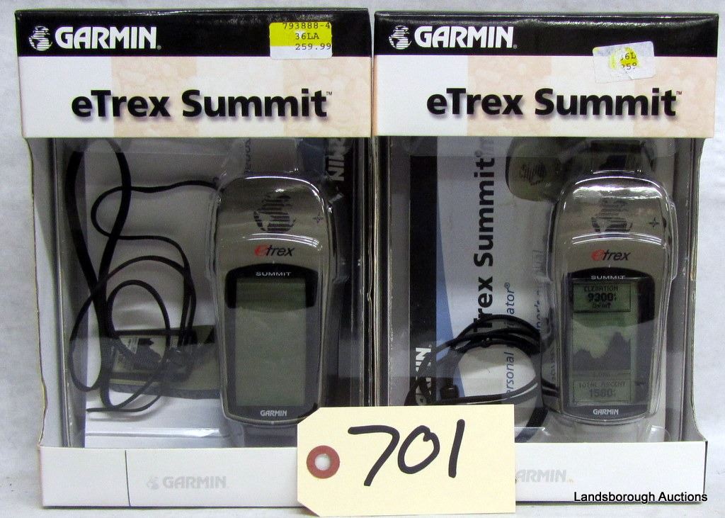 PAIR OF GARMIN ETREX SUMMIT IN BOX. FEATURES GPS, BAROMETRIC ALTIMETER, AND ELECTRIC COMPASS.