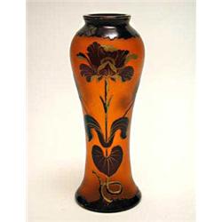 farbloses Glas mit rotbraunem Innen- und rubinrotem Außenüberfang. Geätztes, partiell in flachem Relief goldstaffiertes Lilien-Dekor auf mattiertem Grund. Schlanke Spindelform mit kleiner ausgestellter Mündung. Mündung äu.min.best. H.: 25,5 cm. Unter dem Stand bez.: Harrach (gold gemalt). Um 1915