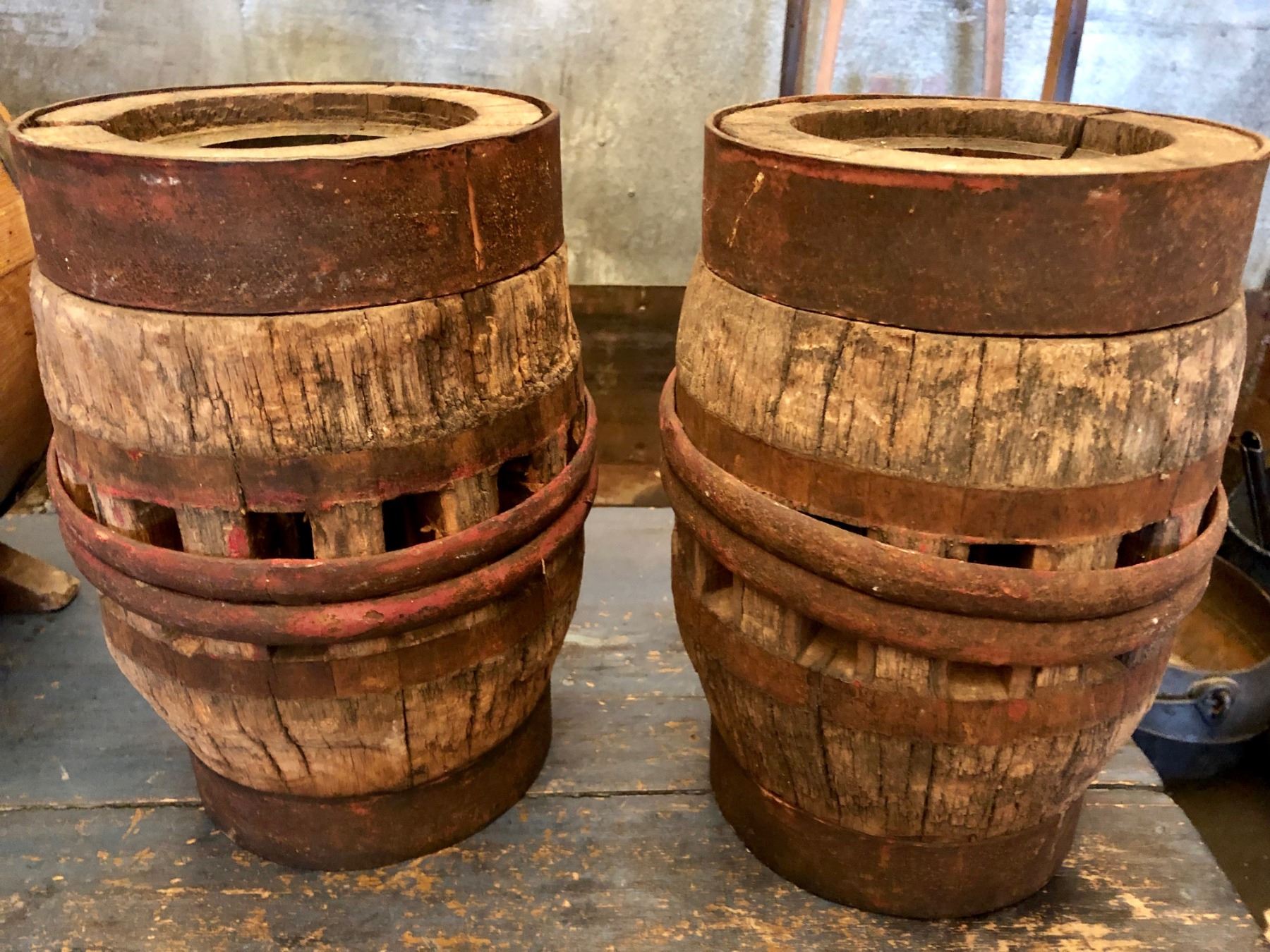 GR OF 2, ANTIQUE WAGON WHEEL HUBS, WOOD WITH METAL BANDING, APPROX 12" TALL.