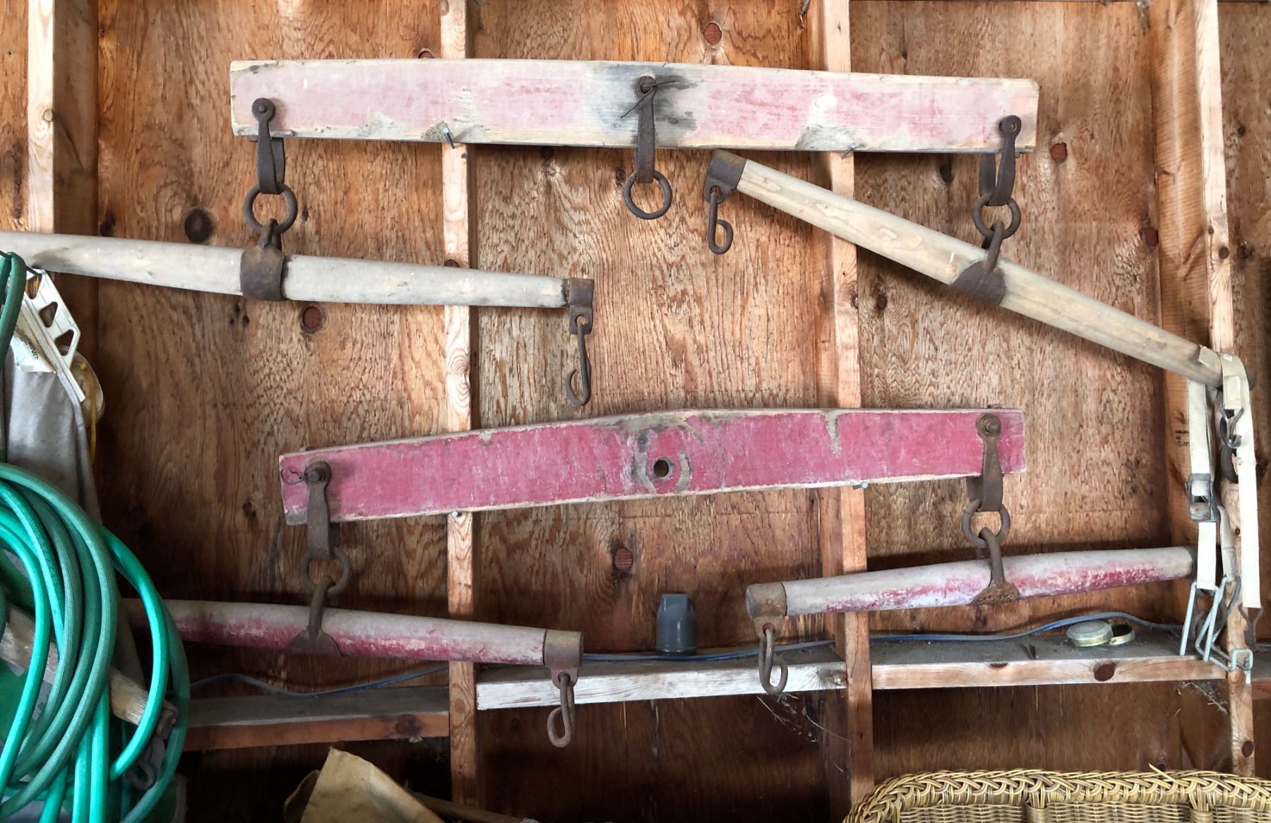 GR OF 2, ANTIQUE WOOD TREE DBL HORSE EVENERS
