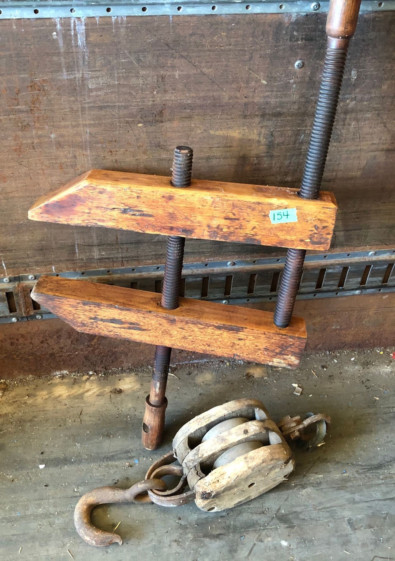 GR OF 2, ANTIQUE WOODEN CLAMP & PULLEY