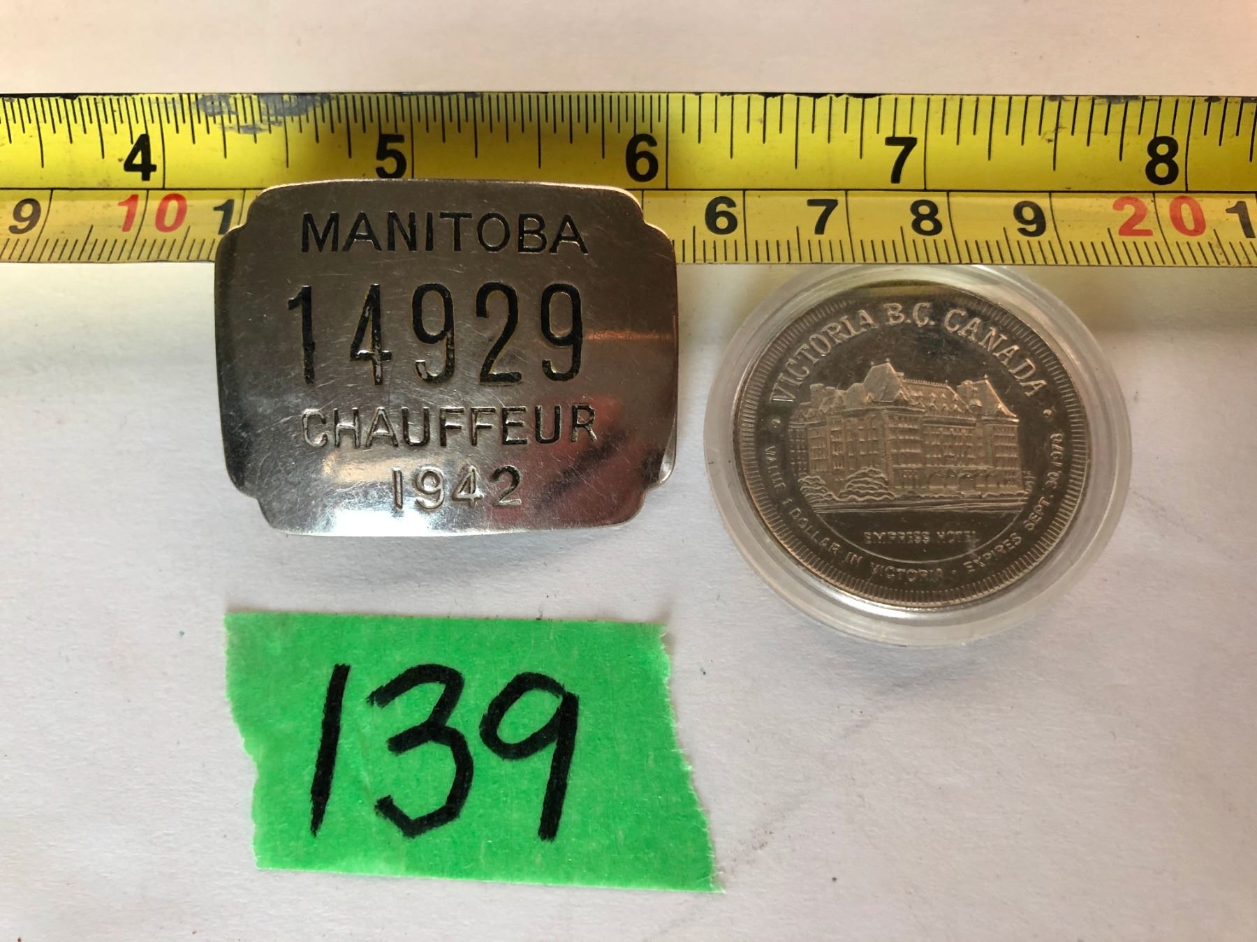 INCLUDES: 1942 MANITOBA CHAUFFEUR'S PIN. 1978 BRITISH COLUMBIA COMMEMORATIVE 1$ COIN.