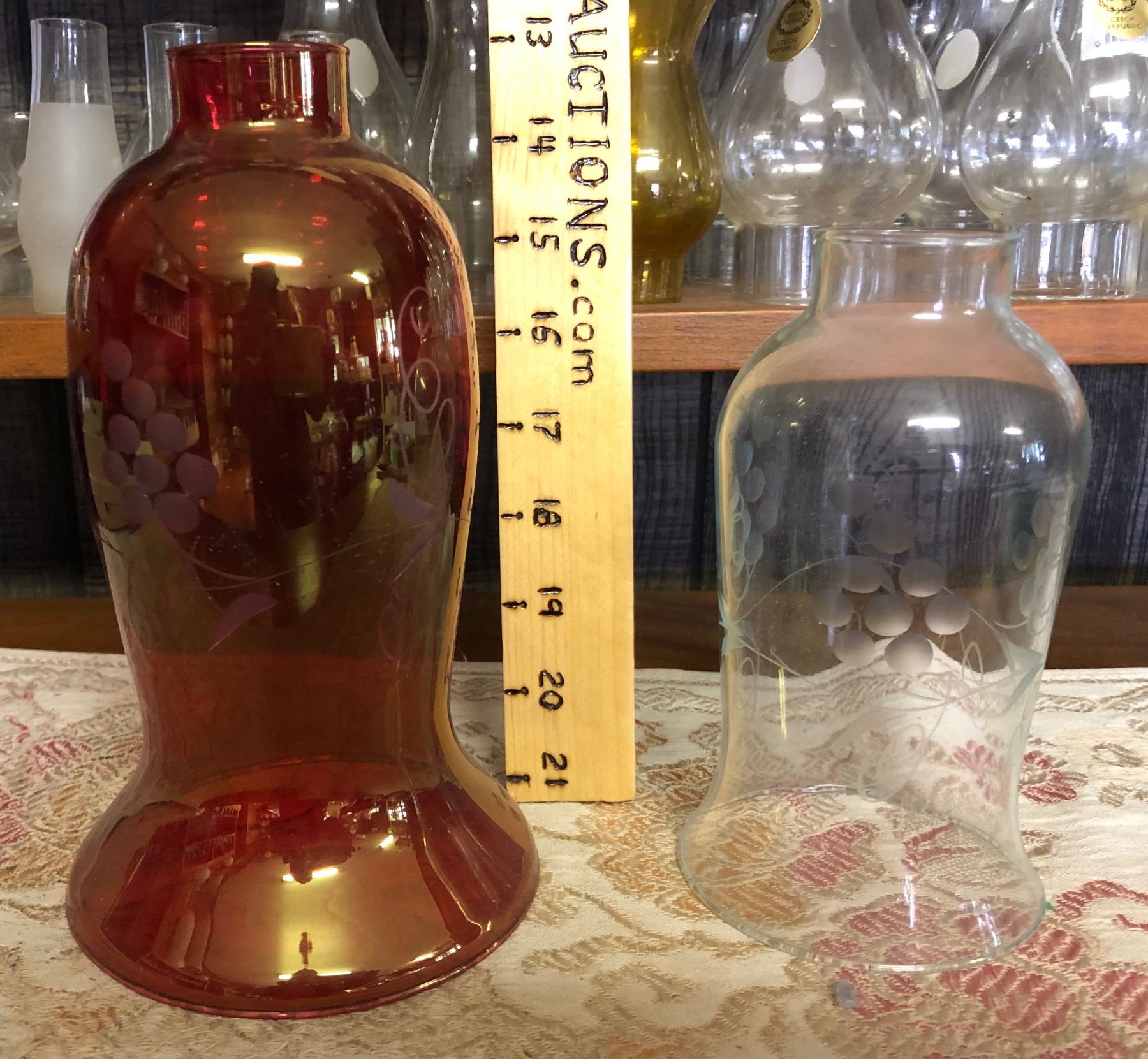 GR OF 2, ETCHED GLASS OIL LAMP CHIMNEYS