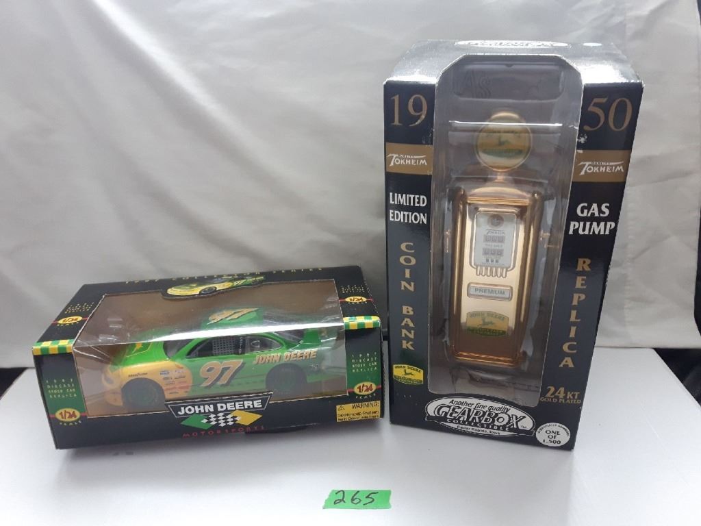 GR OF 2 JOHN DEERE, 1:24 SCALE CAR & GAS PUMP BANK