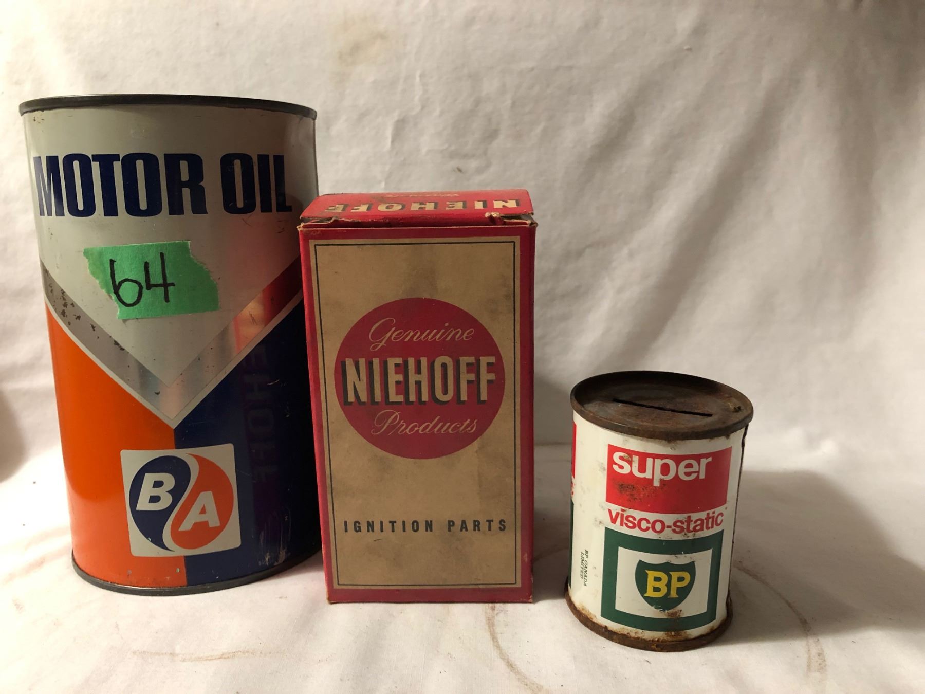 GR OF 3. BA 1 QT TRANSITION TIN - FULL. NIEHOFF VINTAGE BOX W / PART. BP TIN BANK.