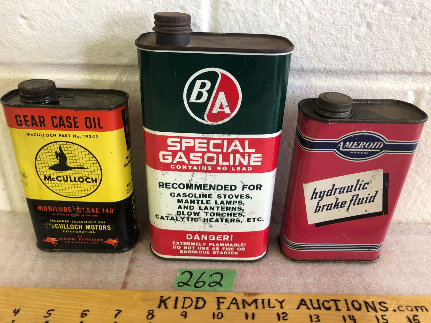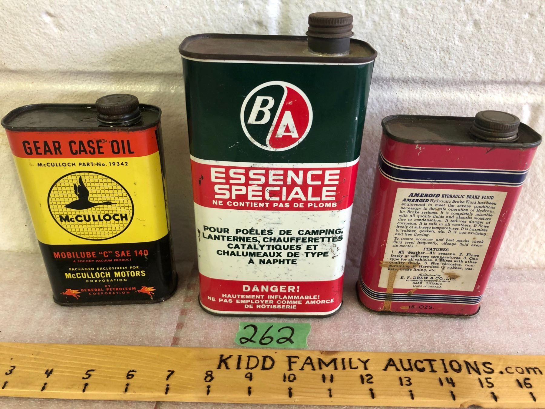 BA 40 OZ SIZE LANTERN FUEL. AMEROID 16 OZ SIZE BRAKE FLUID. MCCULLOCH 1 PT SIZE GEAR OIL. ALL WITH CONTENTS.