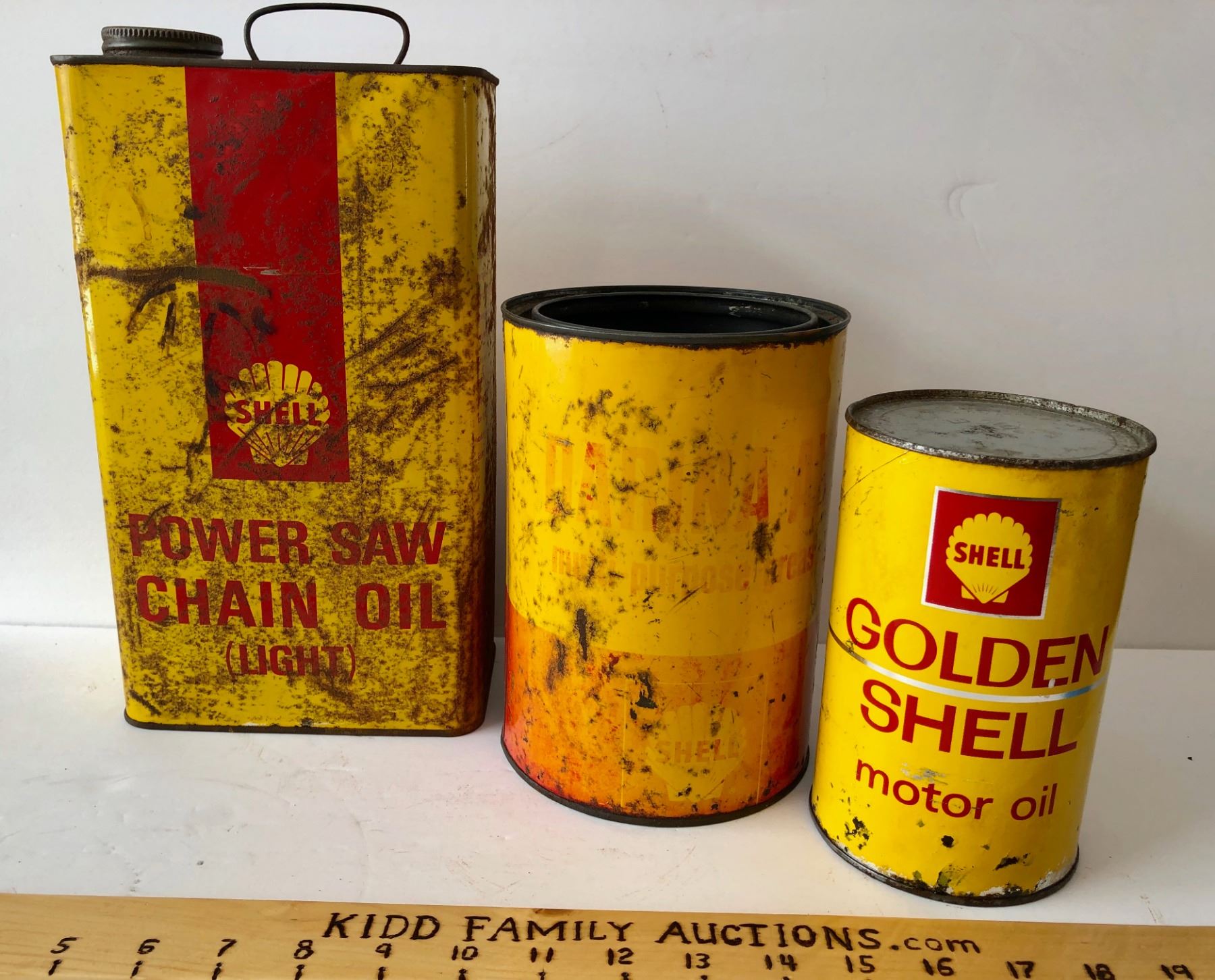GR OF 3, SHELL POWER SAW CHAIN OIL TIN & SHELL MOTOR OIL TINS
