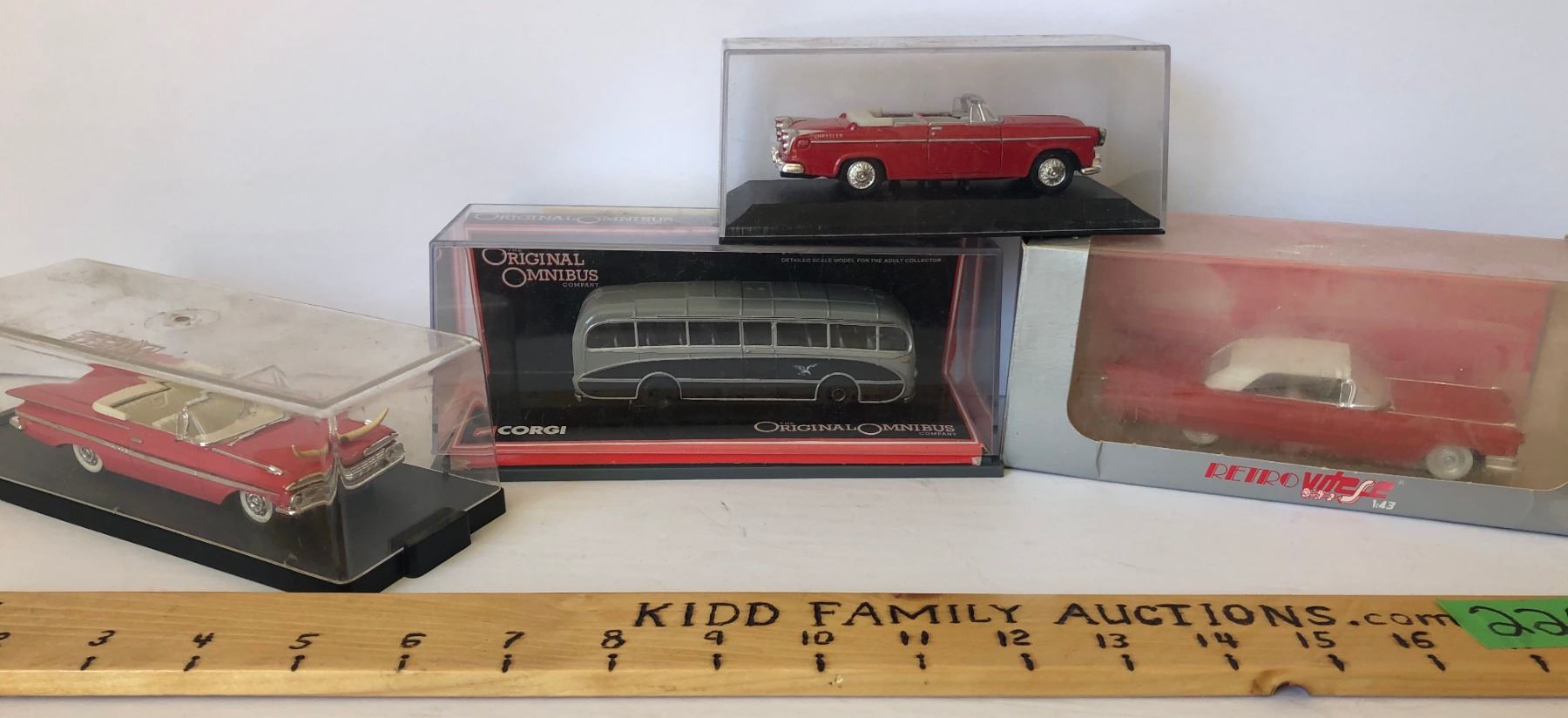 INCLUDES: 3 X VITESSE CARS IN DISPLAY CASE & 1 X CORGI OMNIBUS.