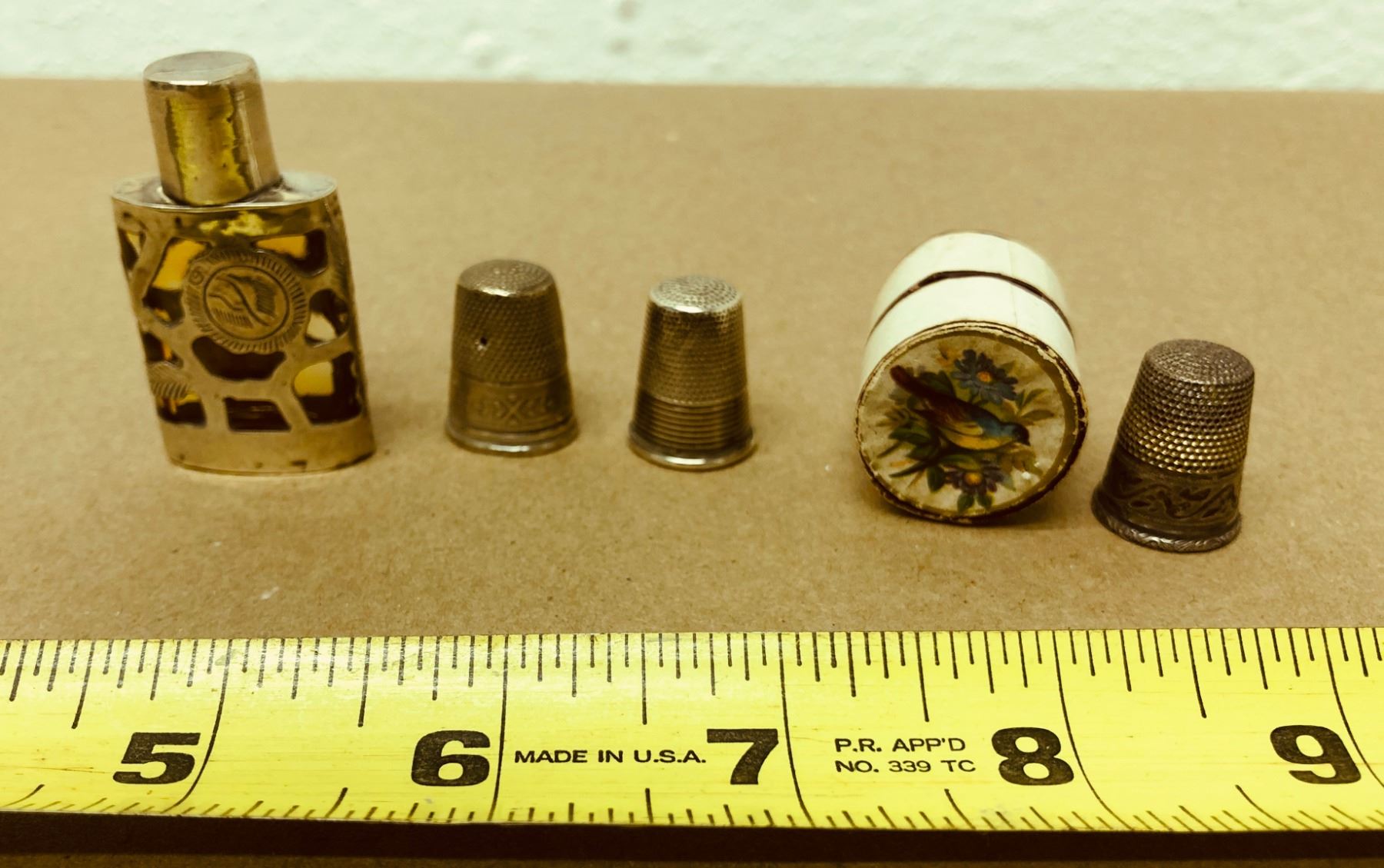 GR OF 4 SILVER THIMBLES & PERFUME BOTTLE - NO MARKINGS