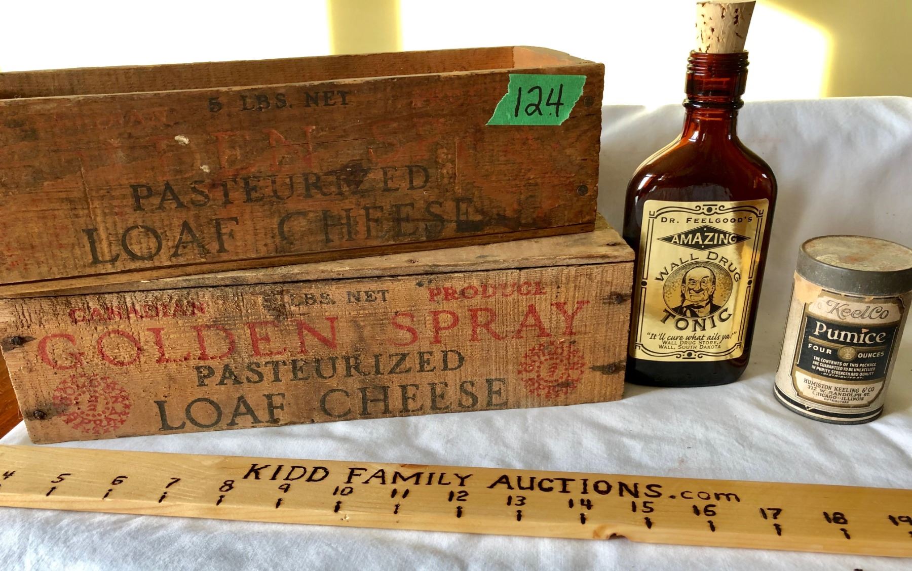 GR OF 4, TWO CHEESE BOXES, TONIC BOTTLE, PUMICE TIN