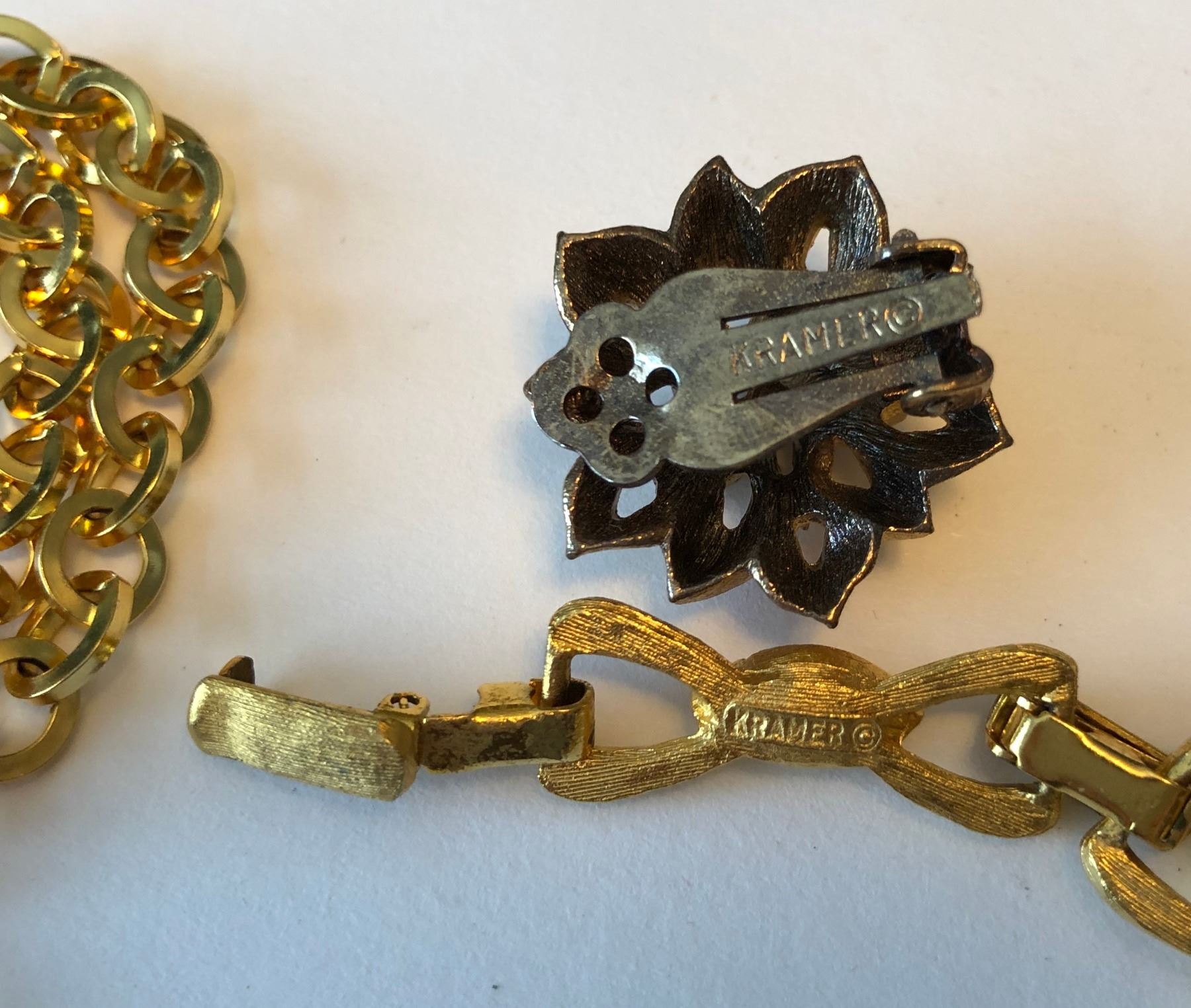 KRAMER DESIGN NECKLACE & EARRINGS. 2 X GOLD CHAINS - NO MARKINGS. BRACELET & EARING SET - NO MARKINGS