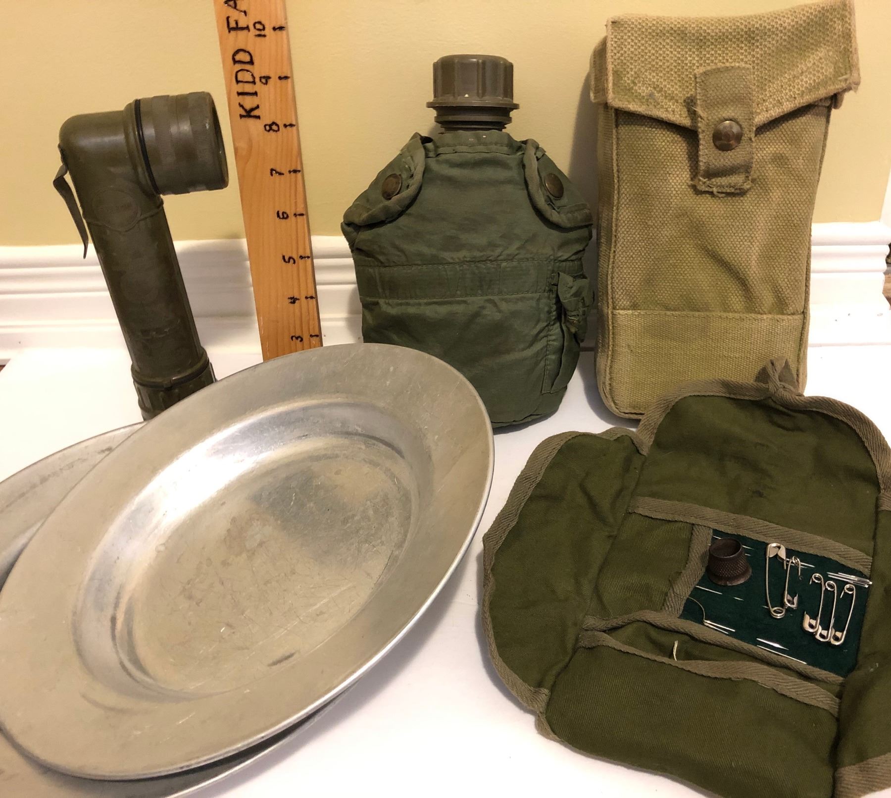 FLASHLIGHT, CANTEEN, ALUM PLATES, CANVAS SACK & COMPLETE SEWING KIT.