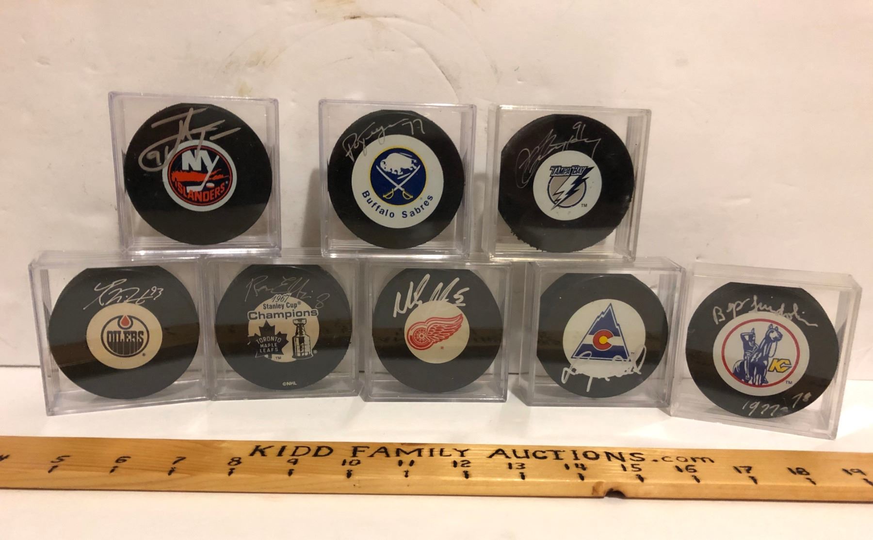 GR OF 8, SIGNED NHL PUCKS - AS NEW