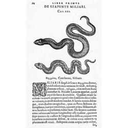 GRÉVIN, Jacques.- De venenis Libri duo. Gallice primum ab eo scripti, et à multis hactenus Latini desiderati, & nunc tandem opera & labore Hieronimiae Martii Augustanae Reipulici Medicinae [...]. Antverpiae, ex officina Christophori Plantini, 1571. In-4° : [20]-332-[10] pp. (grande découpe comblée au titre, qqs trous de vers marginaux, sans le dernier feuillet qui est blanc). Rel. de l'époque : plein vélin souple (taches, lacets de fermeture et ff. de gardes volantes manquants). Edition originale de la traduction en latin par Hieremias Martius des "Deux livres des vénins", ouvrage de toxicologie fort inspiré par "Les Oeuvres de Nicandre" que Grévin avait traduites en français. L'ouvrage traite des vénins, poisons, contrepoisons et diverses thériarques. Il est illustré d'une cinquantaine de bois in texto figurant des serpents, scolopendres, scorpions, huîtres, araignées, plantes (coriandre, pavot, aconite...) gravés par Jean de Gourmont d'après Geoffroy Ballain. La princeps en français fut publiée chez Plantin en 1568. Jacques Grévin (Clermont-en-Beauvaisis 1538-1570 Turin) était à la fois médecin et poète.# Nissen, ZB, 1713; # Durling 2174; # Wellcome I-2934 (éd. 1568); # Voet 1267; # BT 1336; # Adams G1244; # pas dans Sorgeloos, ni BB, ni Machiels. 1.400 Euros