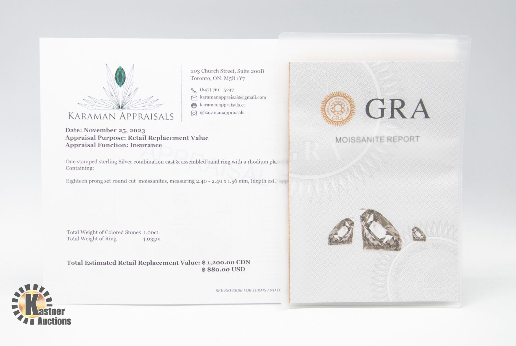 CARAT MOISSANITE SET IN 925 STERLING SILVER RING SIZE 8 APPRAISED VALUE $1,200 **ALL ITEMS MUST BE REMOVED BY 5PM SATURDAY, JANUARY 6TH 2023. ALL REMAINING ITEMS WILL BE SUBJECT TO A $6.00 PER DAY STORAGE CHARGE. ANY ITEMS REMAINING AFTER MONDAY, JANUARY 22ND, 2023 WILL BE CONSIDERED FORFEITED. NO REFUNDS WILL BE ISSUED FOR FORFEITED ITEMS. TO SCHEDULE A PICK UP APPOINTMENT CLICK HERE