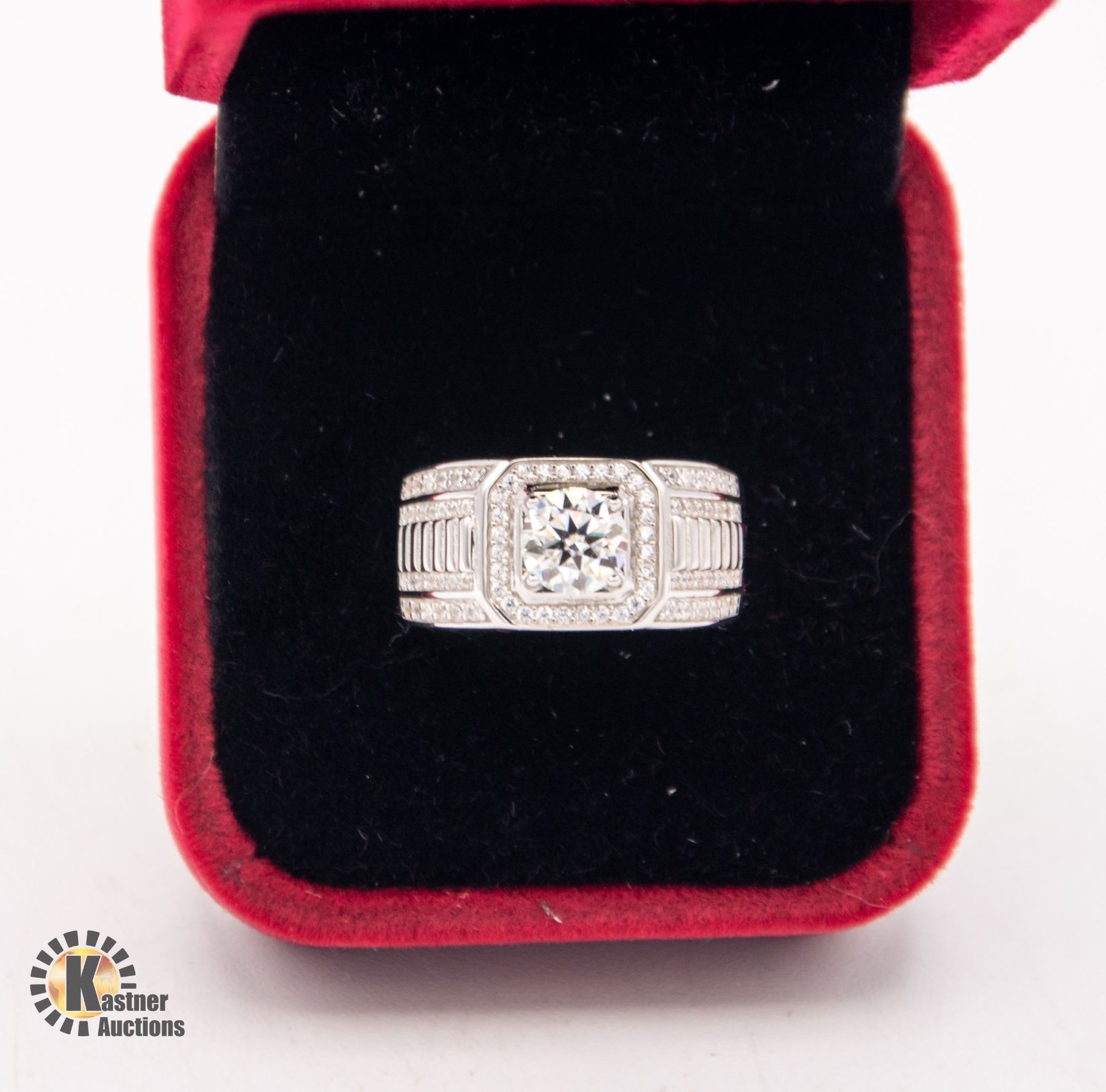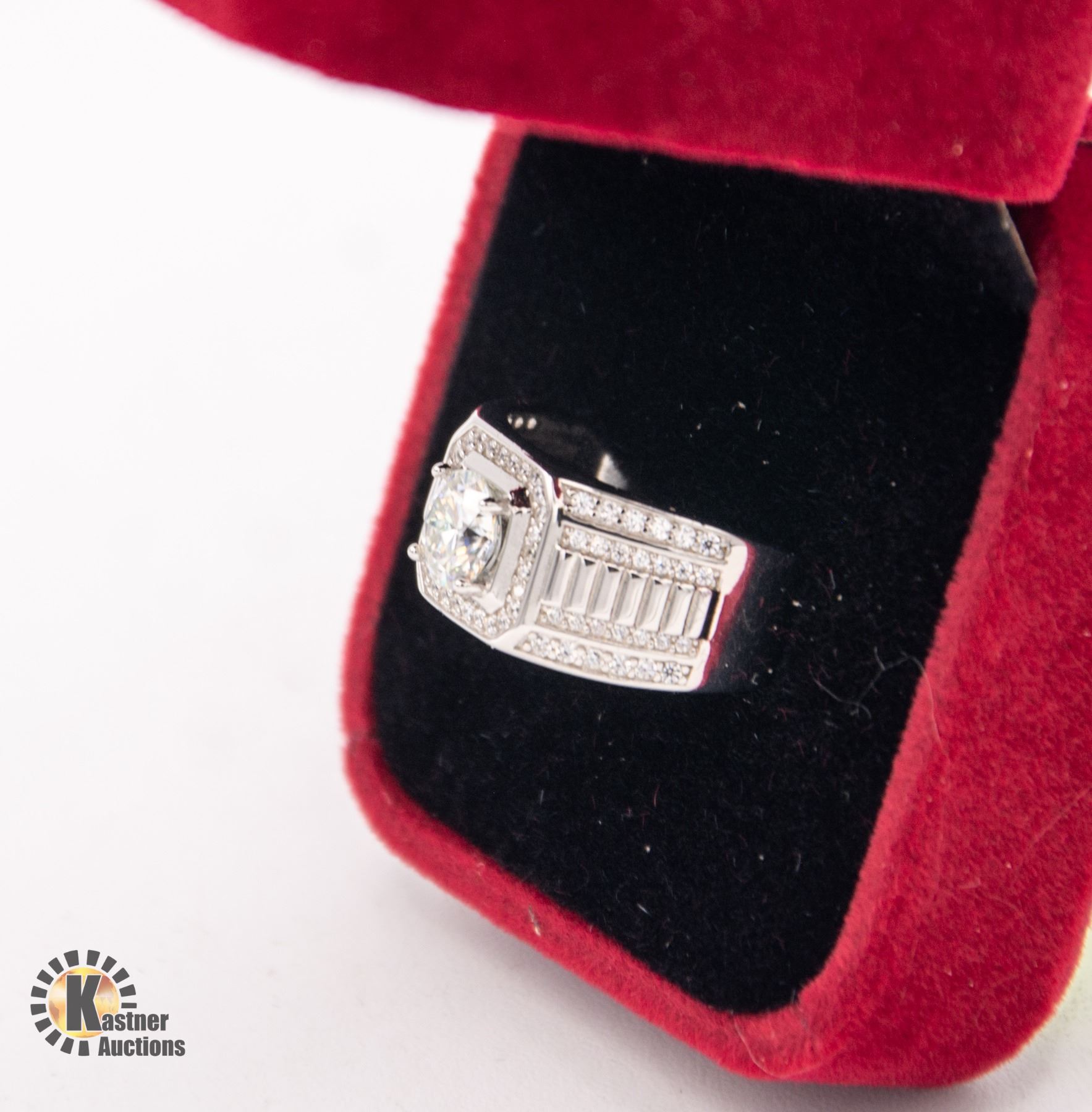 WEIGHING 1.00 CARATS WITH 84 CUBIC ZIRCONIUM SET AROUND THE CENTER AND DOWN SHAFT OF THE RING RING SIZE 9 **ALL ITEMS MUST BE REMOVED BY 5PM SATURDAY, FEBRUARY 3RD 2024. ALL REMAINING ITEMS WILL BE SUBJECT TO A $6.00 PER DAY STORAGE CHARGE. ANY ITEMS REMAINING AFTER MONDAY, FEBRUARY 19TH, 2023 WILL BE CONSIDERED FORFEITED. NO REFUNDS WILL BE ISSUED FOR FORFEITED ITEMS. TO SCHEDULE A PICK UP APPOINTMENT CLICK HERE