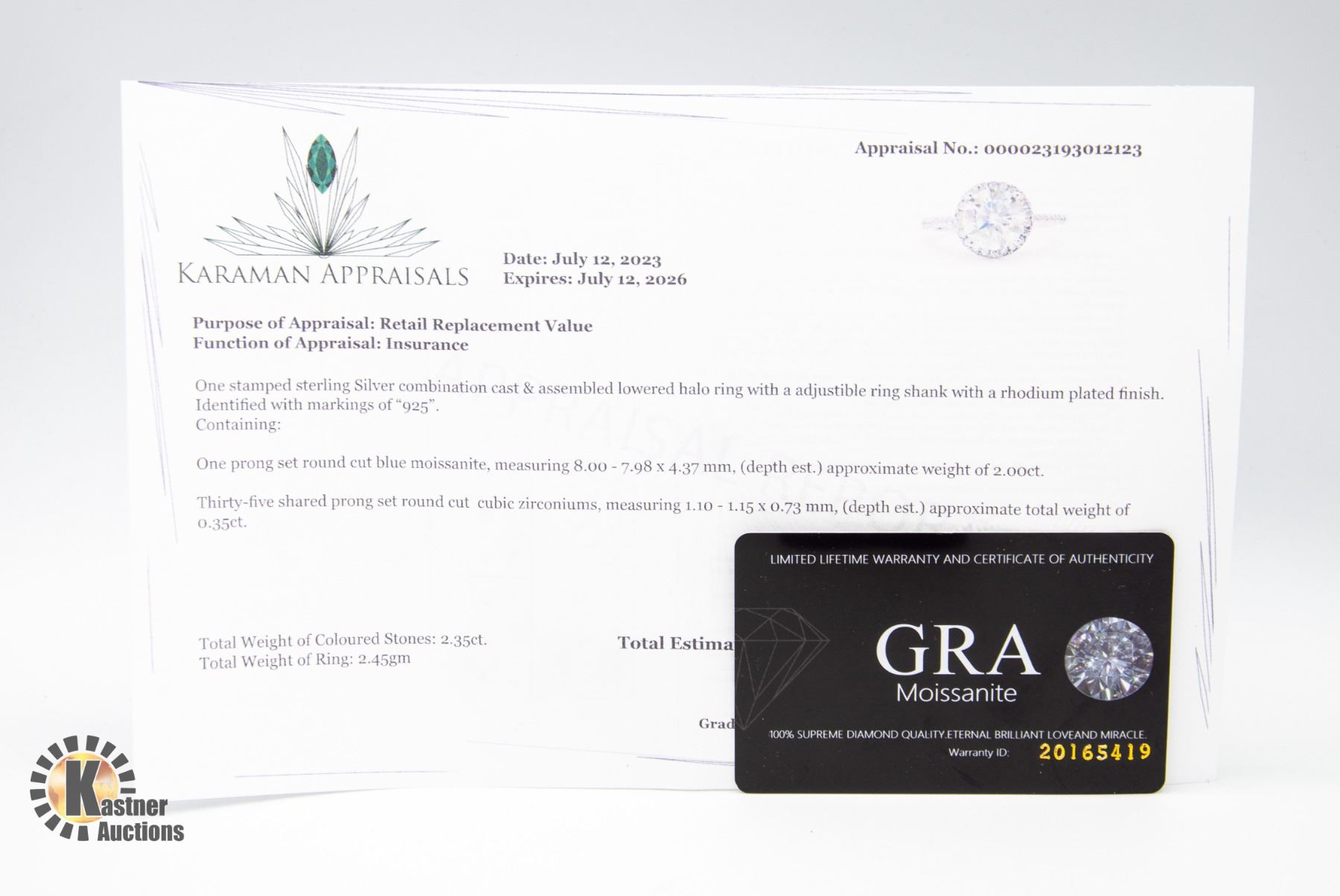 MOISSANITE SET IN 925 SILVER WITH 35 CUBIC ZIRCONIUM IN HALO AND WITH MORE IN SHANK OF RING. RING SIZE ADJUSTABLE APPRAISED VALUE $2,100.00 **ALL ITEMS MUST BE REMOVED BY 5PM SATURDAY, JANUARY 6TH 2023. ALL REMAINING ITEMS WILL BE SUBJECT TO A $6.00 PER DAY STORAGE CHARGE. ANY ITEMS REMAINING AFTER MONDAY, JANUARY 22ND, 2023 WILL BE CONSIDERED FORFEITED. NO REFUNDS WILL BE ISSUED FOR FORFEITED ITEMS. TO SCHEDULE A PICK UP APPOINTMENT CLICK HERE