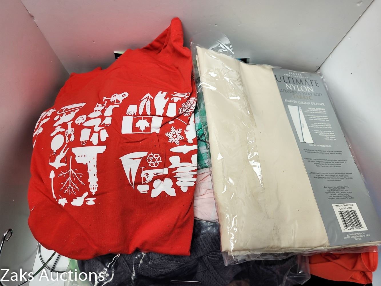 GRAB BOX OF CLEAN CLOTHES AND HALLOWEEN HAIR, ETC