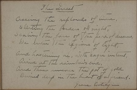 (1879-1957) First Lady, wife of Calvin Coolidge, 30th President of the United States. Scare A.Ms.S. 1p. sm. 8vo., [n.p., n.d.], an original poem by the first lady better known for her chic hospitality. Titled "The Quest", it reads: "...Crossing the uplands of time, Skirting the borders of night, Scaling the face of the peak of dreams, We enter the regions of light. And hastening on, with eager intent, Arrive at the rainbow's end, And there recover the pot of gold, Buried deep in the heart of a friend". Signed at conclusion. Little is known of Coolidge's poetry save for that published within her letters, but this particular poem was mentioned as one of her best by her daughter Lydia Coolidge Sayles during a speech made in 1998 at The JFK Center. Simply matted and framed, light toning, very good. Not examined out of frame.