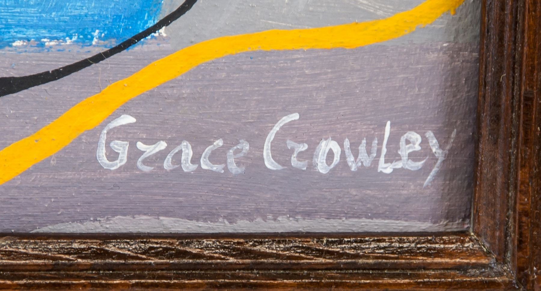 Oil on canvas, framed. Featuring an abstract expressionist composition. SIgned and attr. Grace Crowley (Australian, 1890-1979) on the lower right corner. 41 x 50.5 cm (16.1 x 19.9 inches). Born Grace Adela Williams Crowley, she has been recognized a key Sydney modernist in the inter-war period. While studying in Paris in the late 1920s under the cubist artists André Lhôte and Albert Gleizes, she went on to establish an art school with Rah Fizelle which became the principal centre for modernist painting in Sydney until its closure in 1937. Crowley’s own work was a modified, academic cubism based on planar geometry and dynamic symmetry. The daughter of a wealthy grazier, Crowley was born in 1890 at Cobbadah, New South Wales. While at school in Sydney, she studied part-time at the Julian Ashton Art School in 1907 before returning to the family home in Glen Riddle, Barraba. Despite the fact that her parents did not want her to pursue a career in painting, Crowley resumed art classes in Sydney in 1915 under Mildred Lovett and Elioth Gruner, in addition to Ashton, and worked as Ashton’s assistant from 1918 to 1923. Crowley travelled to Europe with fellow artist Anne Dangar in 1926, studying briefly at the Académie Colarossi in Paris and then with André Lhôte, whose teaching emphasised solid geometric structure over colour and who introduced Crowley to the theories of academic cubism as well as the geometric systems of dynamic symmetry and the golden section, which she later brought to Sydney. While displaying her solid grasp of anatomy, acquired through earlier academic training at the Julian Ashton Art School, Crowley’s strongly delineated contours and volumetric modelling of her subjects accords with Lhôte’s emphasis on the simplification of forms into basic geometry. Produced while attending Lhôte’s academy in Paris, Portrait of Lucie Beynis 1929, depicts a professional model painted over a sequence of morning sittings and reflects Lhôte’s modified version of cubism in which the human figure is retained, held within a field of dissecting geometric planes and shafts of colour running through the body. This approach continued to dominate Crowley’s semi-abstract paintings during the 1930s, until her departure into pure abstraction in the 1940s. Crowley returned to Sydney in 1930, holding her first and only solo exhibition at Black’s Modern Art Centre in 1932. That year she established her own school with ex-student Rah Fizelle, which focused on teaching developments in modern French art. Students included Ralph Balson, who would become a close friend and artistic collaborator. Crowley invited Balson to her studio in George Street, Sydney, on the weekends, a practice captured in The artist and his model 1938, which portrays Balson painting on the studio’s roof terrace. Revealing a disintegration of figurative forms and division of pictorial space into decorative areas, this work also signals a growing commitment, shared by both artists, to complete abstraction. The following year Balson reciprocated with his Portrait of Grace Crowley 1939, executed in a quasi-abstract style that similarly prefigures the artists’ shift into non-figuration. In 1939, Crowley and Balson took part in Exhibition I at David Jones Art Gallery, Sydney, a climactic event for the Sydney semi-abstract movement. With other participating artists, including Fizelle, Frank Hinder, Margel Hinder, Gerald Lewers, Frank Medworth and Eleonore Lange, they collaborated in the 1930s as leaders of the second phase of the modern movement in Australia, developing the earlier ideas of Roland Wakelin, Roy de Maistre and others that dated from the beginning of the First World War. Crowley and Balson continued to exhibit purely non-objective works throughout the 1940s and early 1950s with the Contemporary Group, exemplified in Crowley’s balanced compositions, Abstract Painting 1947 and Abstract Painting 1950. The two travelled to Europe from 1960 to 1961, and following Balson’s death in 1964, Crowley continued to advocate his work. A Crowley retrospective was organised by the Art Gallery of New South Wales in 1975 and her work also featured in the Gallery’s Sydney Moderns in 2013. 14 inches x 17.5 inches. PROVENANCE: Southern Ontario estate