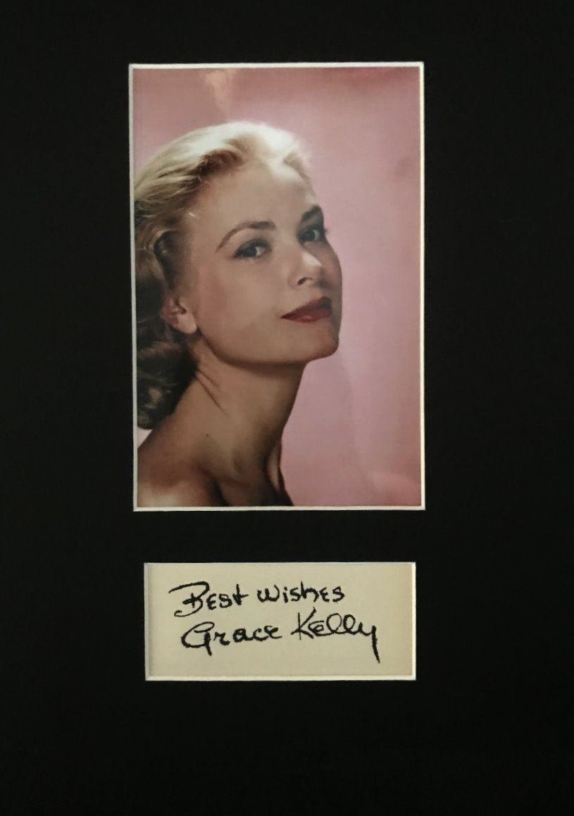 An album page signed cutting by Princess of Monaco Grace Kelly. She made only eleven feature films, in a career that lasted just five years, from 1951 to 1956. Then what was called the wedding of the century. On April 18, 1956, in a real-life fairytale, American actress Grace Kelly became a princess when she married Monaco's Prince Rainier. Professionally mounted and framed and supplied with coa.
