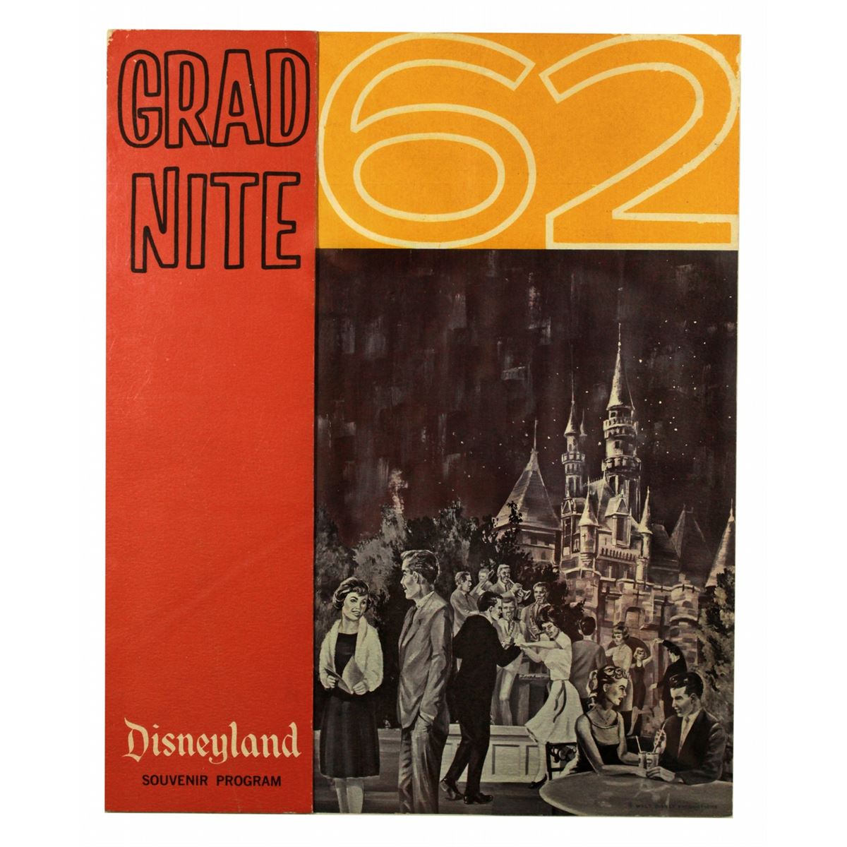 This 1962 grad nite folder for the second year of the event. Single-sided, measures 11"x9" folded, and 11"x15" when unfolded. Fine condition, with some creasing, wear, and mild discoloration throughout.