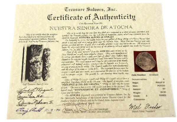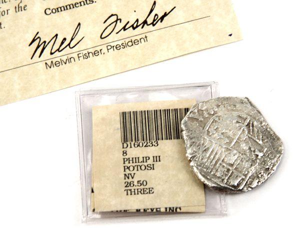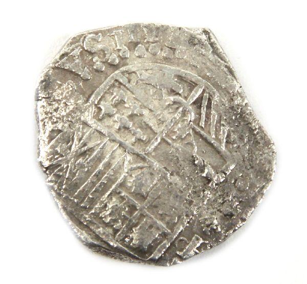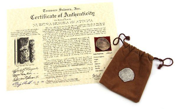 Grade three pieces of eight silver cob coin from the shipwrecked Spanish Galleon Nuestra Senora de Atocha. The ship was lost September 6, 1622 in a hurricane off the coast of the Florida keys, to be found almost 363 years later with cargo on July 20th, 19