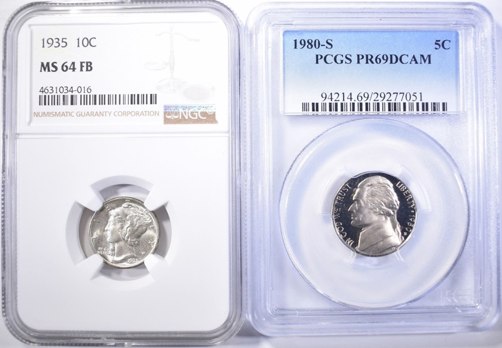 1980-S JEFFERSON NICKEL, PCGS PR-69 DCAM & 1935 MERCURY DIME, NGC MS-64 FB ESTIMATE $70 - $80.