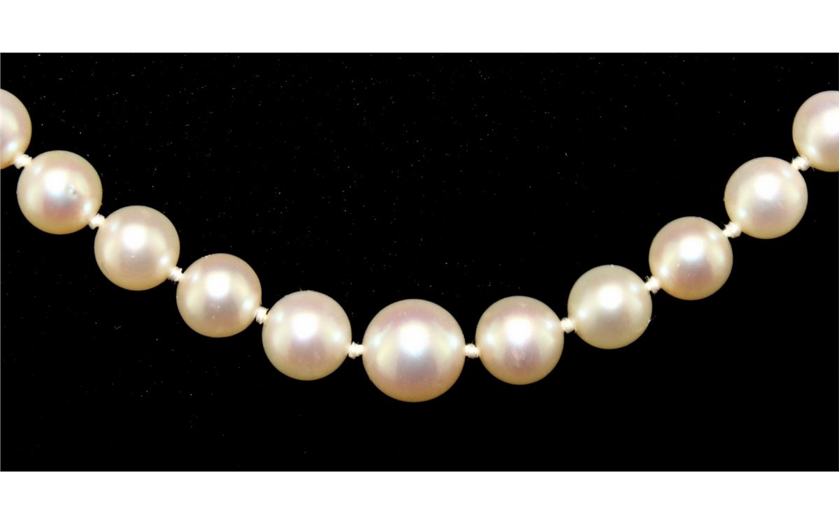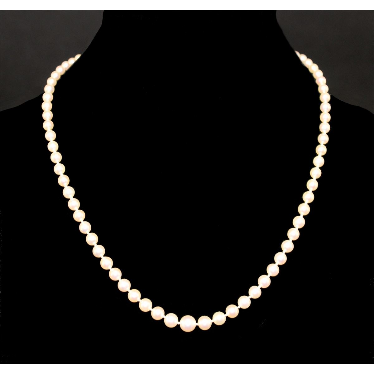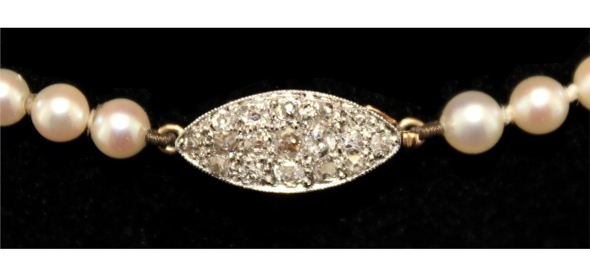 Continental, early 20th century. Single stand with pearls ranging from .5mm - 8mm, with yellow & white gold shaped oval clasp set with 17 faceted diamonds. Length, 20 inches