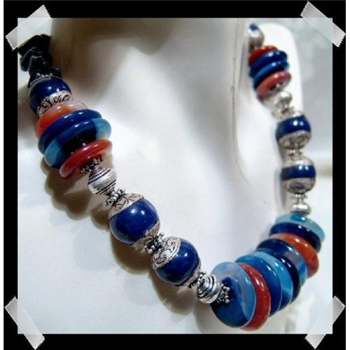 This piece of jewelry, fashioned by Vera, is BIG and SO Bold! A complimentary combination of multi-colored onyx disc coupled with capped lapis beads and finished to perfection with tribal silver is a purchase you might want to seriously consider. A great design executed to perfection finished off with the most elaborate 23mm toggle closure...<p>