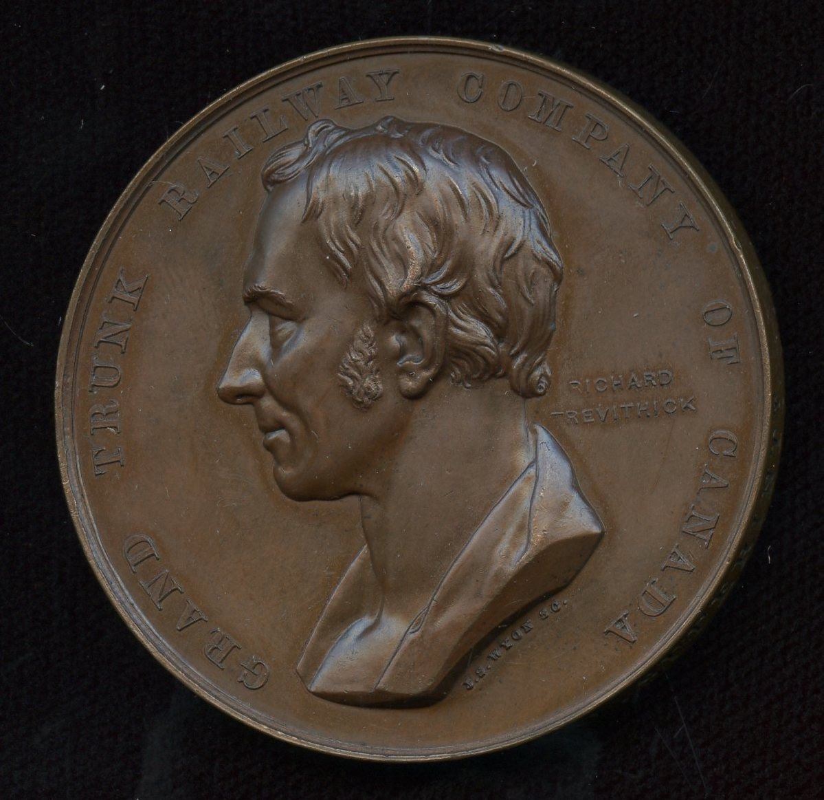Richard Trevithick Medal by J. S. Wyon 45mm Bronze Medal Leroux 640, Breton 109, Charlton 5170. Obverse: GRAND TRUNK RAILWAY COMPANY OF CANADA Bust, left, J. S. WYON signed below. RICHARD TREVITHICK in two lines in the right field. Reverse: an unengraved lozenge Above: PRESENTED BY THE DIRECTORS TO, below FOR GENERAL EFFICIENCY AND GOOD CONDUCT DURING THE YEAR. Edge is impressed "F. H. TREVITHICK LOCO. SUPERINTT" The father Richard had built the first working steam locomotive, the son Frederick Henry Trevithick was the Locomotive Superintendent of the GTR. Contrary to the Charlton Catalogue of Canadian Association, Society Commercial Transportation Medals this medal is known with different edges - plain, F. H. Trevithick, and W. S. Mackenzie SCARCE seldom encountered.