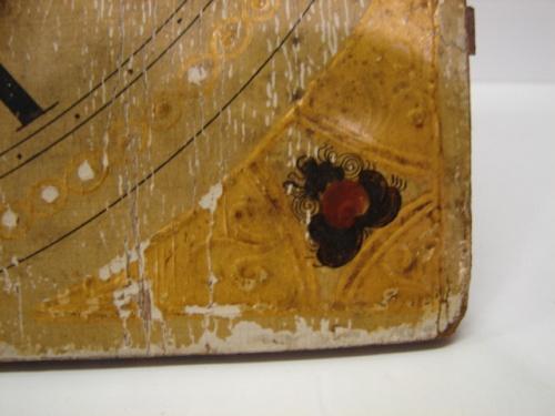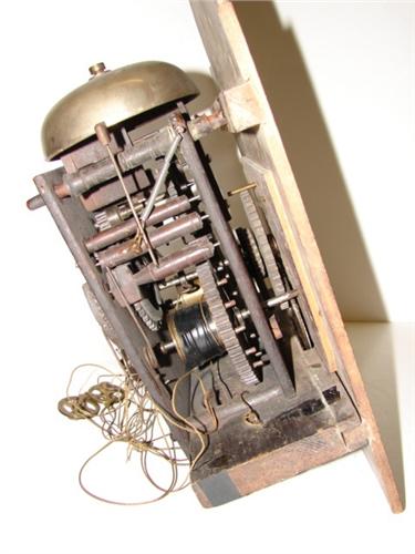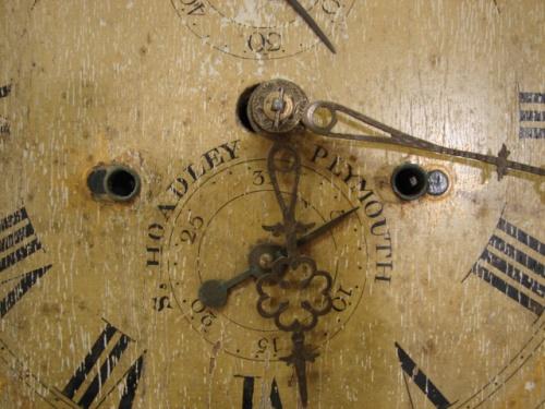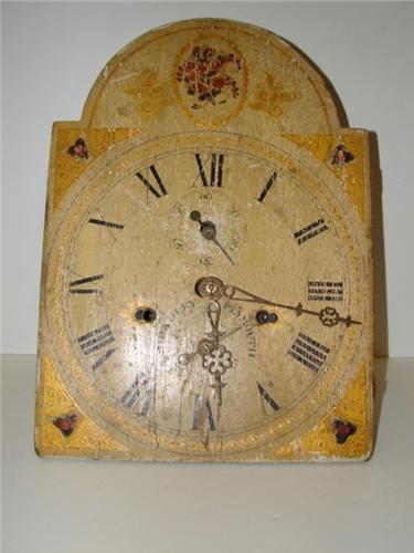 GRANDFATHER CLOCK WORKS. Clock face is marked “S. Hoadley/Plymouth”. Face is decorated with painted floral decoration at top and at corners. 16.25” H, 11.75” W