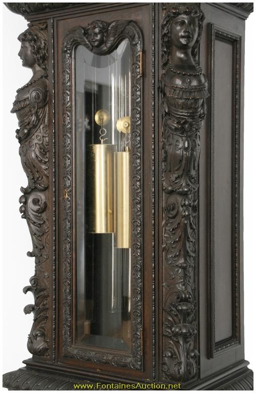 Figural Carved Oak 9 Tube Grandfather Clock, Attr. R.J. Horner. Pierced black hands, pierced filigree brass dial with silvered chapter ring, applied gilt Arabic hour numerals, sub seconds dial, moon phase, sub dials for Chime/Silent and Westminster/Whittington; dial signed Mappin & Webb - Oxford Street, London. Quality brass 9 tube movement, deadbeat escapement, weight driven, quality brass pendulum bob, weights and pulleys, silvered tubes with some tarnish signed Harris & Harrington. Heavily carved oak case with winged griffins and a medallion on the crest, acanthus leaves on the frieze, figural father time carved on the either side of the bonnet door; oversized maiden busts on the corners of the case, with acanthus leaf bottoms running down to the base, fancy carved door with cherub and beveled glass; the base has large winged griffins centered with a medallion showing 2 sailing ships. In excellent working condition, original finish. 27"W x 112"H x 18"D. Estimated Value$75,000 - 100,000.