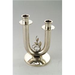 Silber. Auf scheibenförmigem Teller U-förmiger Kerzenleuchter, an den versetzten Enden jeweils Tüllen auf Traufen, mittig zwischen den Leuchtern geschwungene Zweige mit Blättern. H.: 16 cm. Bez.: Firmenmarke, Stadtmarke. Um 1952