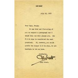 <b>1328. CARY GRANT</b> (1904 - 1986) English actor who often played the suave gentleman in light comedies. T.L.S. on his personal letterhead, 1p. 8vo., [n.p.], July 16, 1955 to Capt. Fouad noting that <i>"...It was kind and flattering of you to request a photograph and I trust this one will please you...If however, you would prefer the larger 11 x14 size, do not hesitate to let me know...</i>". Very good.<b>$200-300</b>