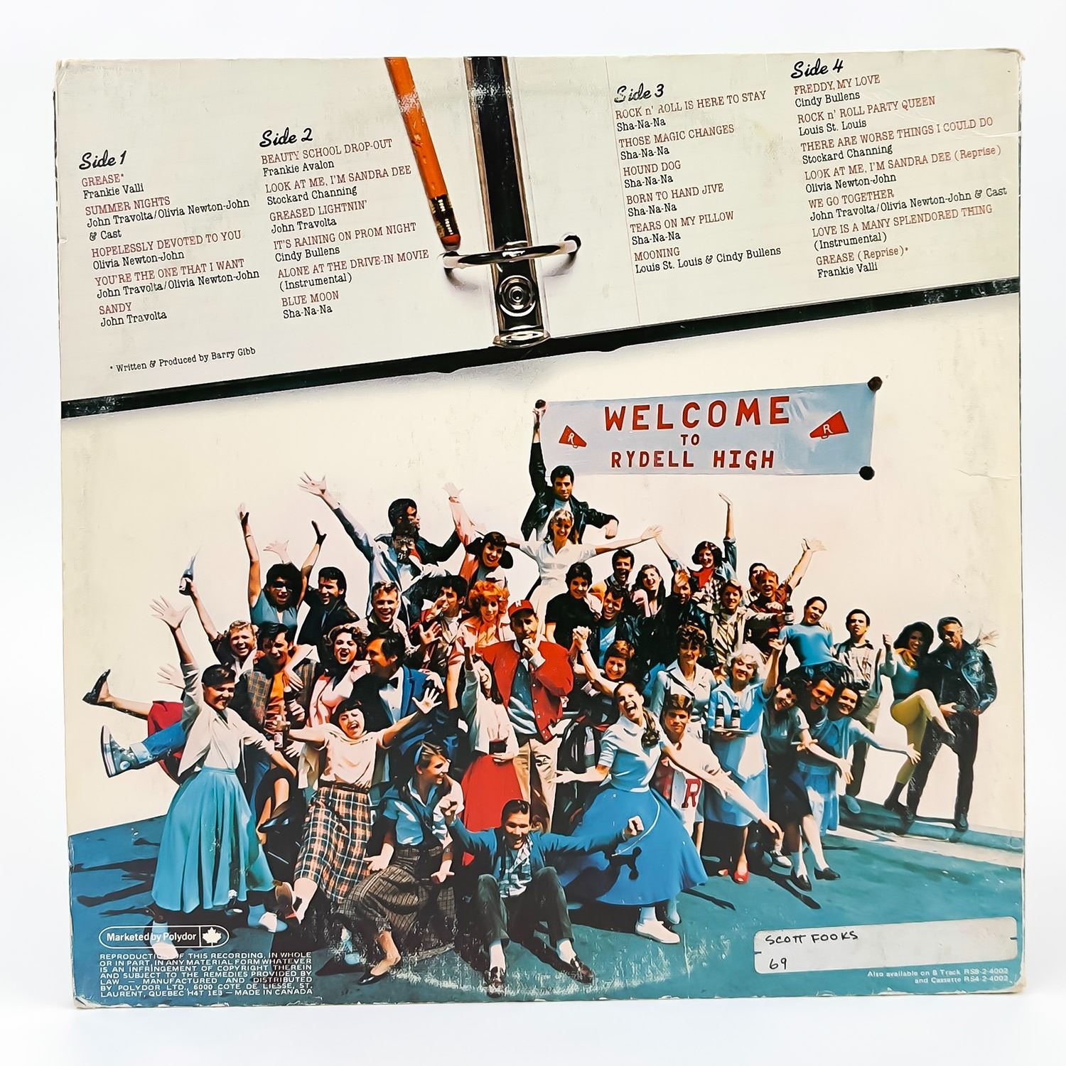 #9401 - 2X VINYL LP GATEFOLD RECORD ALBUM. GREASE - THE ORIGINAL SOUNDTRACK FROM THE MOTION PICTURE. ROCK STAGE & SCREEN, SOUNDTRACK, ROCK & ROLL. VARIOUS ARTISTS: FRANKIE VALLI, JOHN TRAVOLTA & OLIVIA NEWTON-JOHN, FRANKIE AVALON, STOCKARD CHANNING, CINDY BULLENS, SHA-NA-NA, LOUIS ST. LOUIS & CINDY BULLENS. RSO RECORDS RS-2-4002