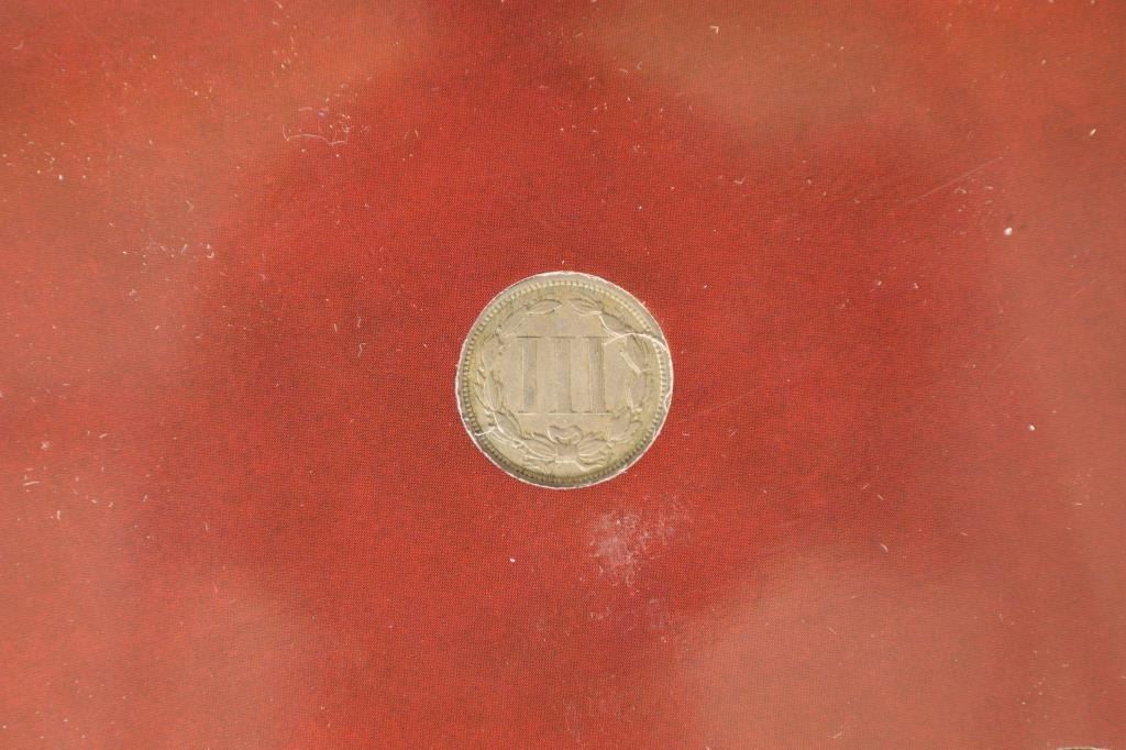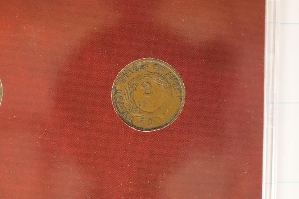 US HALF CENT, 1866 US 2 CENT AND 1873 US THREE CENT "NICKEL" IN DISPLAY CASE. THE HALF CENT IS EF/AU. 2024 REDBOOK PRICE IS $115 IN EF AND $160 IN AU
