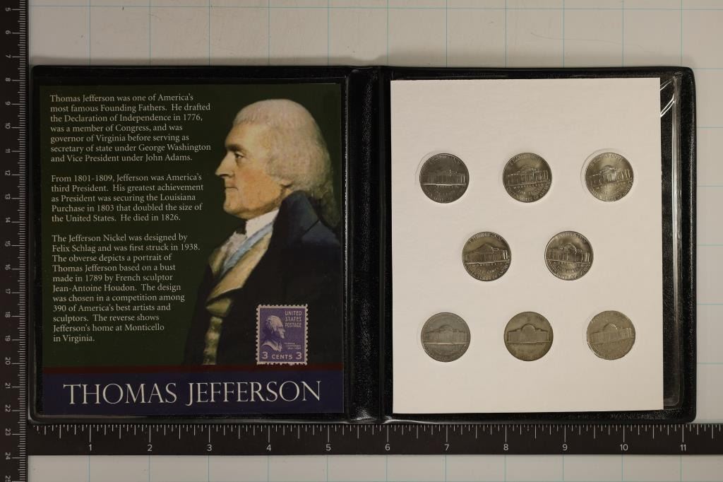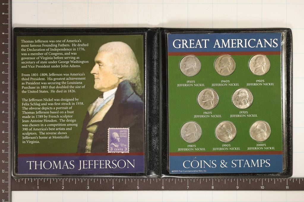 JEFFERSON NICKELS AND 3 CENT UNCANCELLED US POSTAGE STAMP, IN BLACK FOLIO WITH INFO CARD. 1939, 1943-P 35% SILVER JEFFERSON WAR NICKEL, 1955-P, 1964-D, 1979-D, 1989-P, 1999-P AND 2003-D. THE 1960'S-2000'S ARE UNC