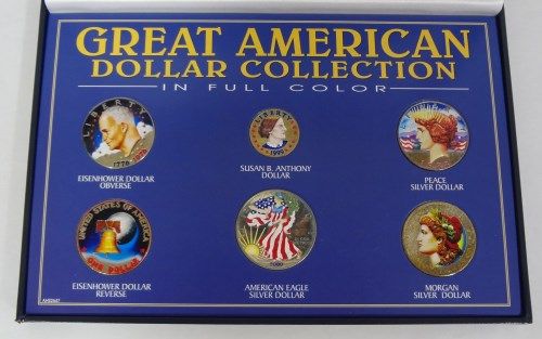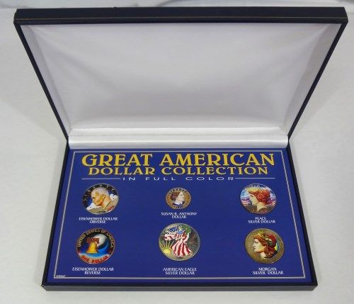 1921 MORGAN SILVER DOLLAR, 1922 PEACE SILVER DOLLAR, 2000 AMERICAN SILVER EAGLE, 1976 BICENTENNIAL EISENHOWER DOLLAR, AND A 1999 SUSAN B. ANTHONY DOLLAR, ALL DISPLAYED IN A NICE PRESENTATION BOX, ESTIMATE, $115.00 TO $125.00 LOTS WON WILL BE BILLED TO YOUR CREDIT CARD ON FILE UNLESS OTHER PAYMENT ARRANGEMENTS ARE MADE PRIOR TO NEXT BUSINESS DAY