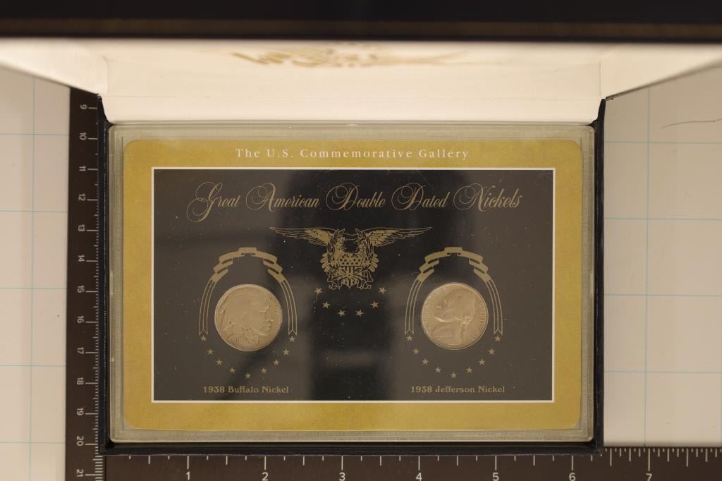 BUFFALO NICKEL AND 1938 JEFFERSON NICKEL. IN HARD PLASTIC CASE AND CLAMSHELL BOX BY THE US COMMEMORATIVE GALLERY