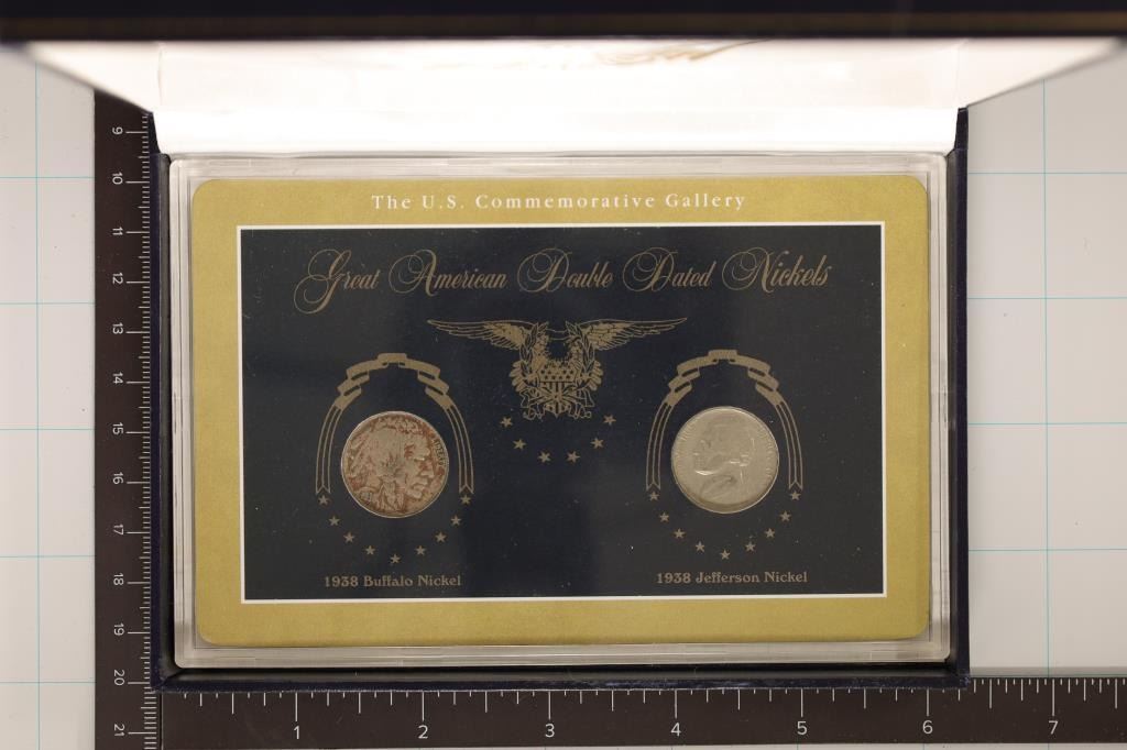 1938 FULL DATE BUFFALO NICKEL AND 1938 JEFFERSON NICKEL IN HARD PLASTIC CASE AND BLUE FLIP BOX FORM THE U.S. COMMEMORATIVE GALLERY.