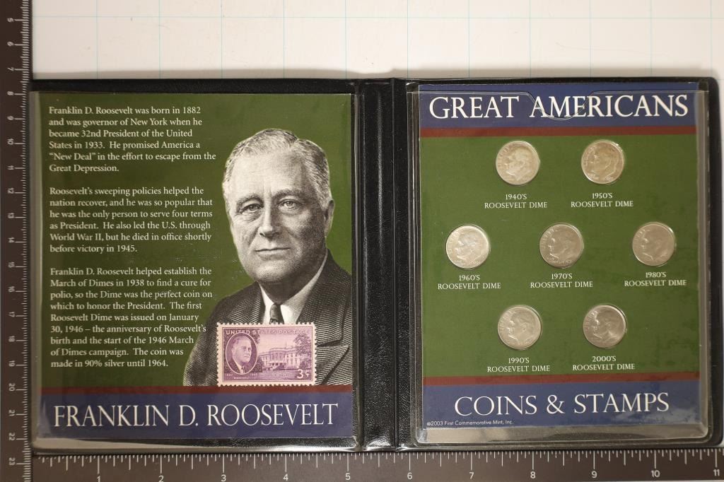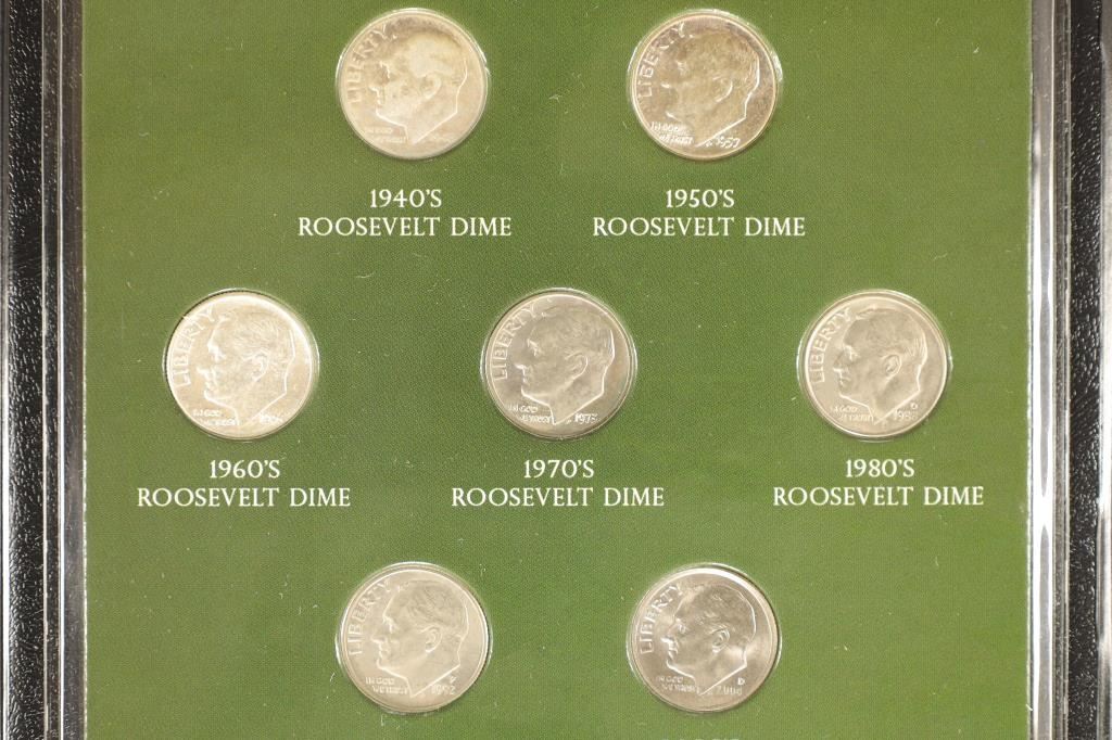 7 ROOSEVELT DIMES: 3 ARE SILVER (1 FROM THE 40'S, 50'S & 60'S), THE OTHER 5 ARE CU (1 FROM THE 70'S, 80'S, 90'S AND 2000'S) HONORING FRANKLIN D. ROOSEVELT WITH 3 CENT STAMP TOO IN NICE BLACK FOLIO FROM THE FIRST