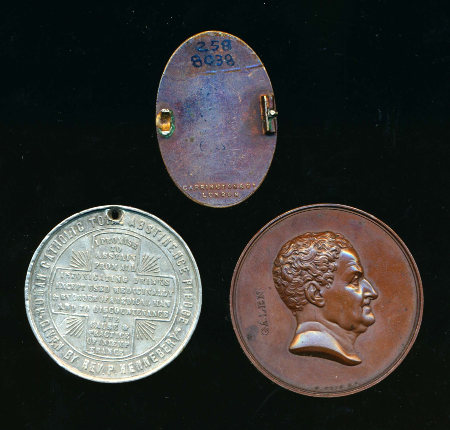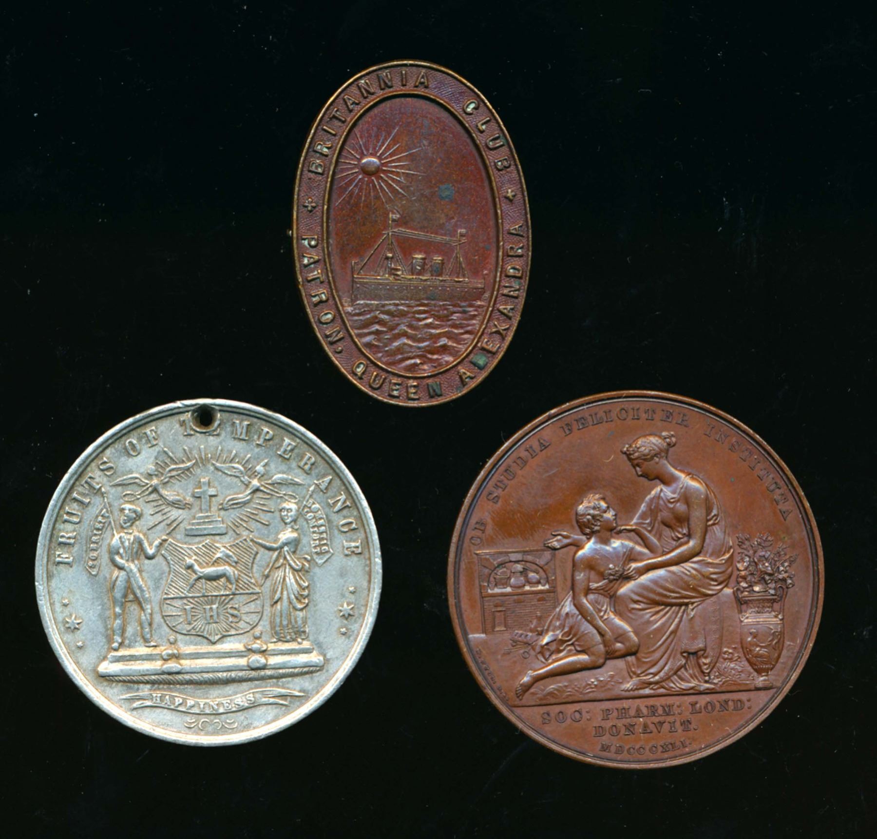 1841 Pharmacy Medal by W.Wyon Eimer # 1360 AE-45 42.0 gms. Edge: Plain EF, 1902-1910 Britannia Club Pin by Carrington & Co. London. Note: the clasp is missing. Bronze Oval-41.5 14.8 gms. There are seven numbers written on the reverse, at the top of the oval, in black ink and painted over with shellac. That matching number comes on the original card used in an auction.The obverse shows a Cunard Line ship sailing right to left on a sunny day and claims Queen Alexandra their patron. Another numbered item 1841 Temperence medal (pierced) WM- 41 having an inked number on the edge and matching discription card. Could be RARE.
