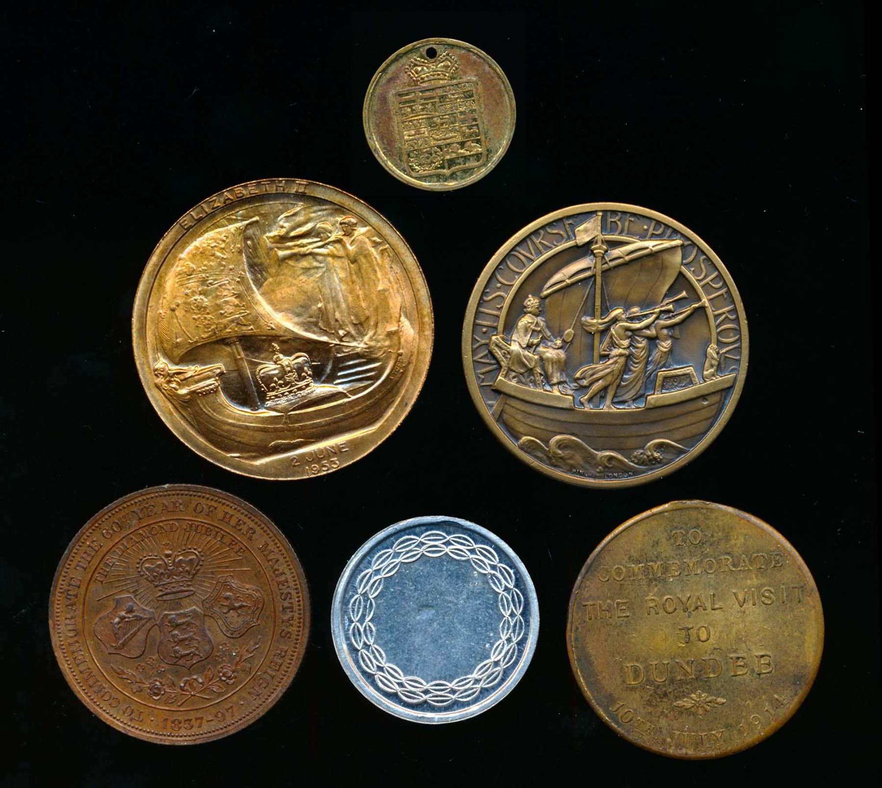 1889-1953 VF-UNC 1897 60 years 4 conjoined heads AE-32 EF, 1911 AE-19 pierced King George V medalette w/ early Canada coat of armes EF, 1914 AE-32 Royal Visit to Dundee VF, 3 x Elizabeth II AE-37 Coronation medal UNC, 1953 Pinches medal UNC and N/D AL-25 with Coronation effigy with wreath on reverse.