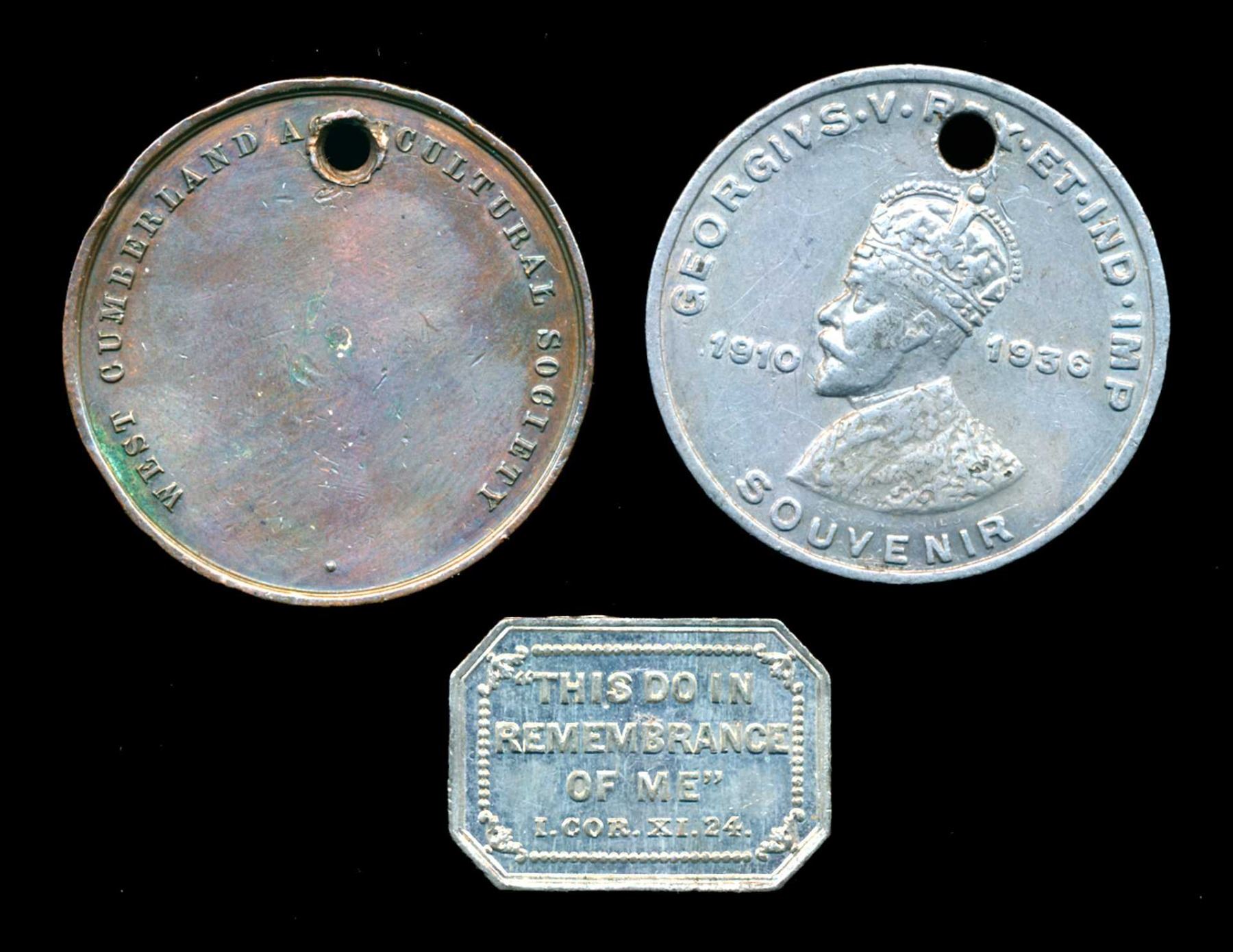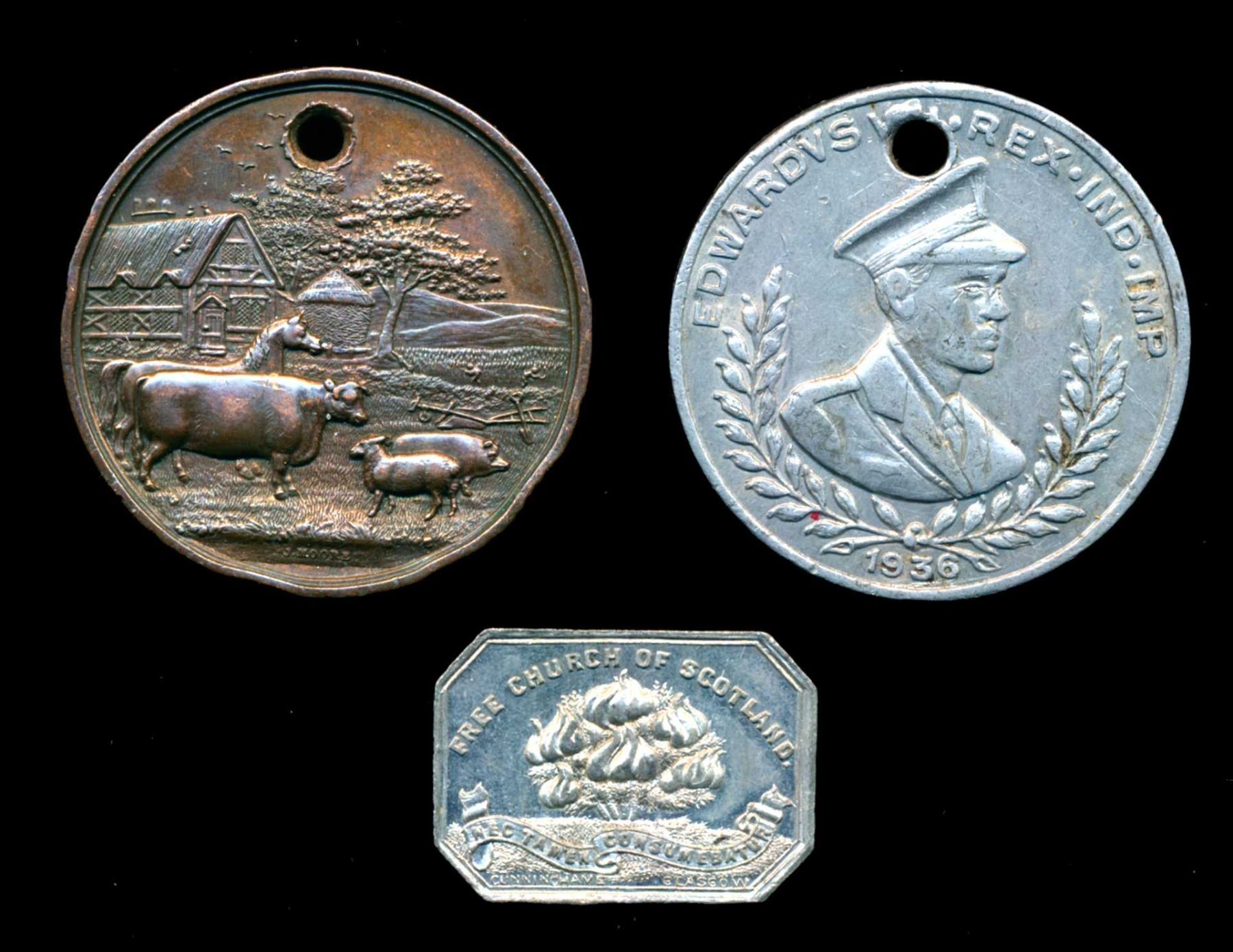 1900 Free Church of Scotland communion Token made by David Cunninghame of Glasgow Unc, a RARE medal by Joseph Moore (of Model Coin fame) for the West Cumberland Agricultural Society AE-38 unawarded and holed. Possible sample ?? VF and 1936 Edward VIII/George V souvenir medal AL-37 holedVF+