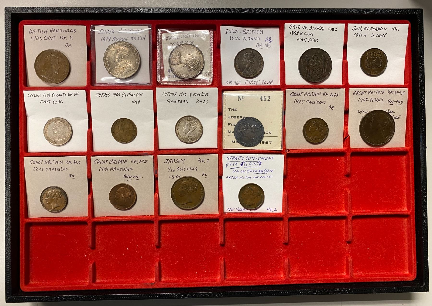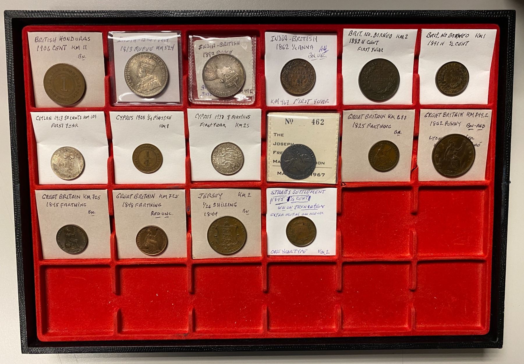 GREAT BRITAIN AND COLONIES: LOT of 16 coins, including British Honduras (1 pc), British India (3), British North Borneo (2), Ceylon (1), Cyprus (2), Great Britain (5), Jersey (1), and Straits Settlements (1); average circulated grades, as well as a couple uncs, in consignor's 2x2 holders, viewing recommended; retail value $825, lot of 16 pieces.