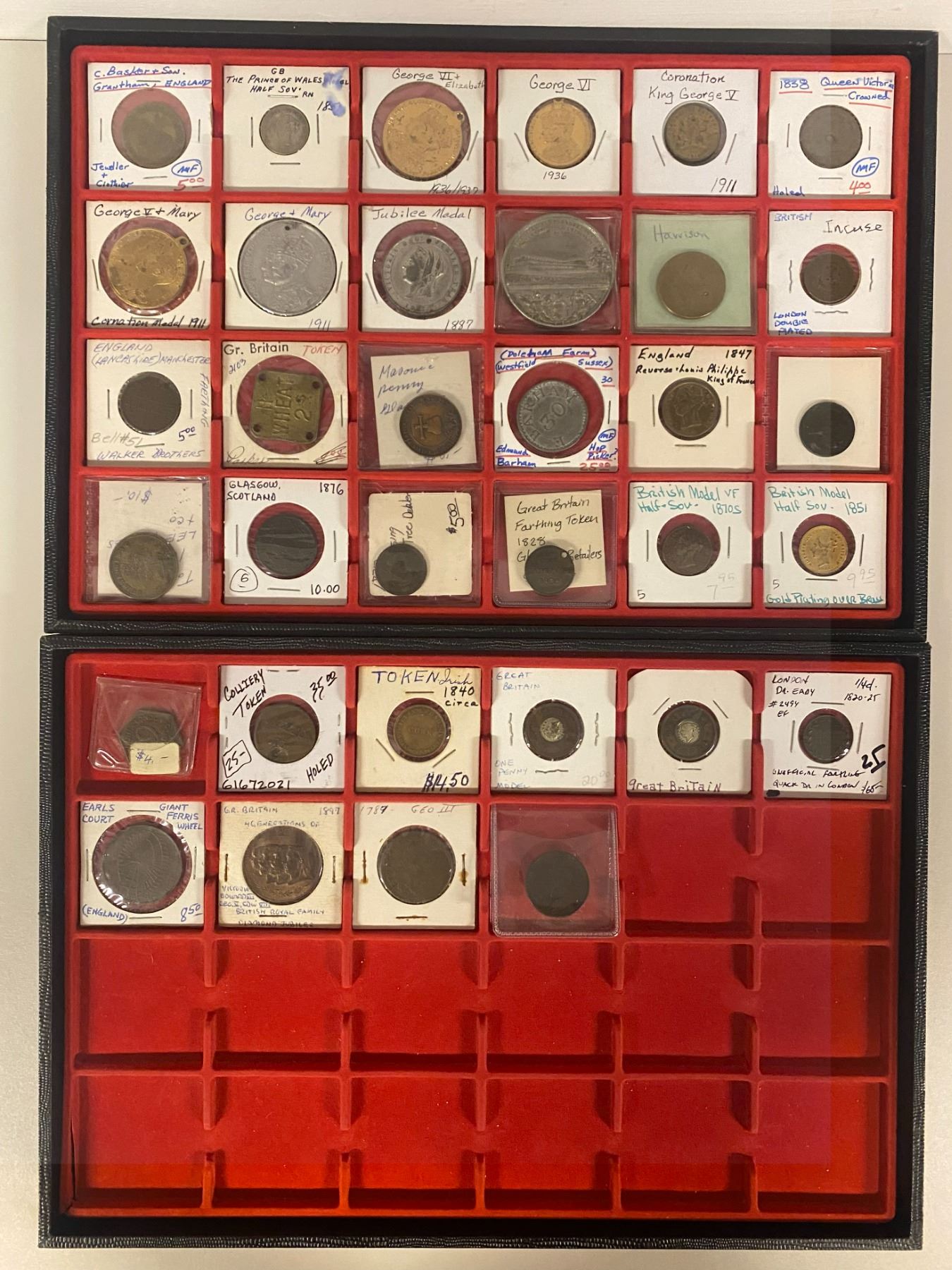 GREAT BRITAIN AND COLONIES: LOT of 35 tokens and medals, all base metal, including advertising tokens, model coinage, coronation medals, Jubilee and Exposition medals, a weight, grain token, masonic token, hop picker token, tea token,etc.; average circulated grades, as well as a few uncs, in consignor's 2x2 holders, viewing recommended; retail value $ 675, lot of 35 pieces.