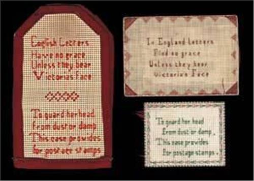 c.1870 Stamp Case: 3 Superb embroidered stamp cases each with rhyming verse 'England's letters fine no grace, Unless they bear Victoria's face, To guard her head from dust or damp, This case provides for postage stamps', very fine condition
