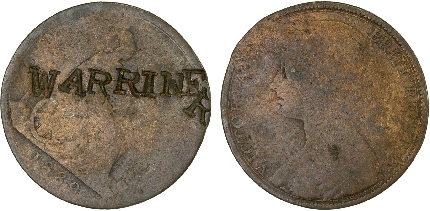 GREAT BRITAIN: Countermarks, AE penny, ND, WARRINE R countermark on 1889 British penny, VF on worn host.