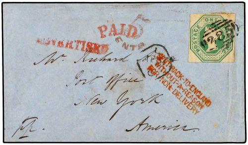 1854(April 21st) Cover to Post Office, New York, USA franked by single Embossed 1847-54 1s green tied by ´385´ Exeter obliterator paying 1s ½ ounce rate. On arrival marked ´Paid´ and ´5 Cents´ struck with ´Advertised´ also in red. Three line ´Sent Back To England-Without A Reason-For Non-Delivery´. A pretty cover. SG 55.